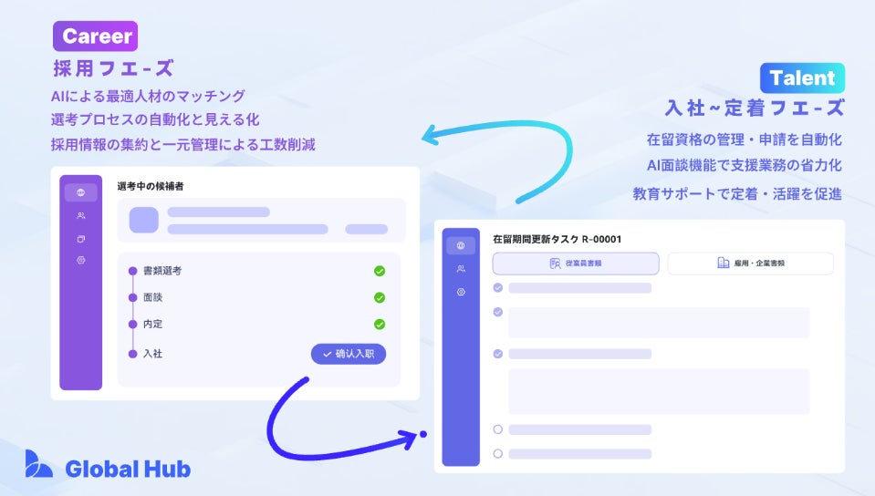 LincのAI採用プラットフォーム Global Hub Career(グロハブキャリア)との連携によって、母集団形成から採用管理、在留資格申請、そして入社後の研修・定着支援まで、外国人材雇用の全工程を一気通貫でカバー。
