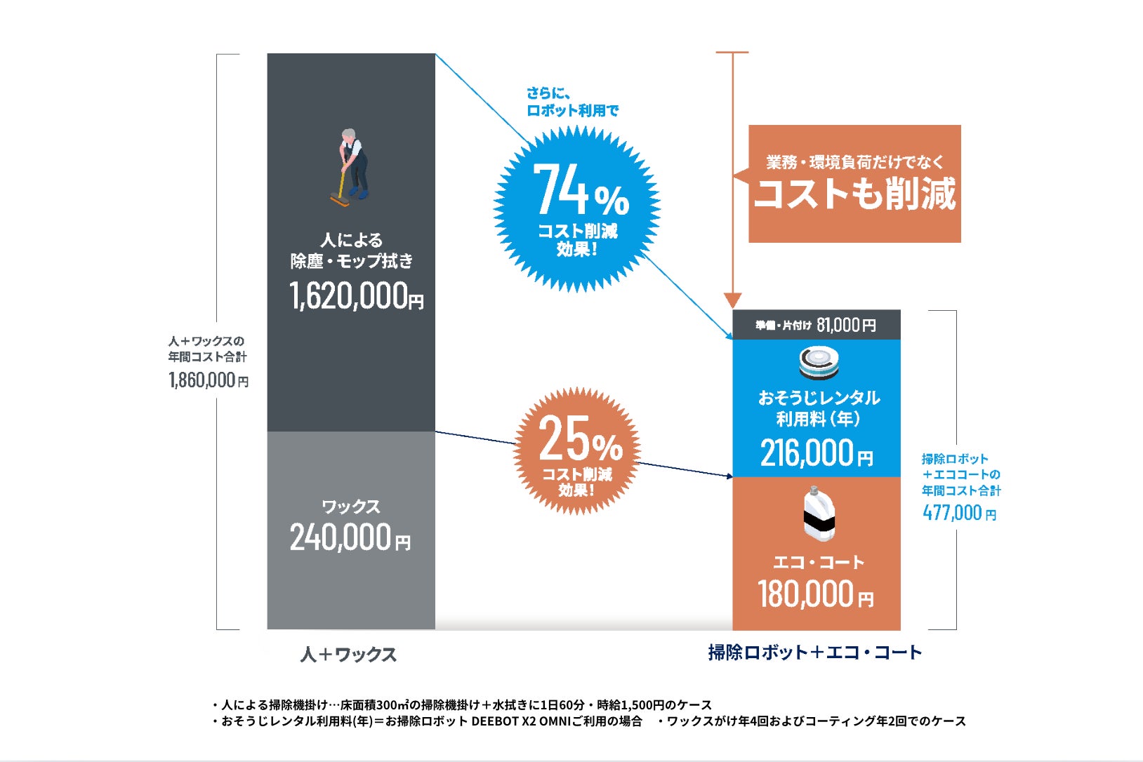 フロアにおける清掃では、日常的な掃除では落しきれない汚れや、施設の利用に伴い経年劣化していく床維持材の補修のためワックスがけ作業などが行われています。「Reエコ・コート」では、掃除機掛けやモップ拭きといった普段のお手入れだけでも簡単に汚れを落とせるようにコーティング。フロアのキレイを手間なく維持できるようになります。さらに、掃除ロボットを活用すれば、最大74%のコスト削減とフロア掃除にかける時間の大幅な短縮を実現します。