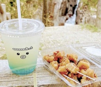 これまでレストランとして食事を提供していたスペースを大幅にリニューアル。キャンパーや観光客向けの気軽なテイクアウトメニューの販売に変更し、名物のタコの唐揚げや、観光名所「神割崎」を模した神割カレーが人気。その他、キャンプやBBQ向けの地元食材の販売、キャンプグッズや日用品のラインナップを充実させています。最寄りのコンビニ、スーパーやホームセンター等は車で20分程と気軽にアクセスが難しいため、買い忘れなどがあっても安心です。