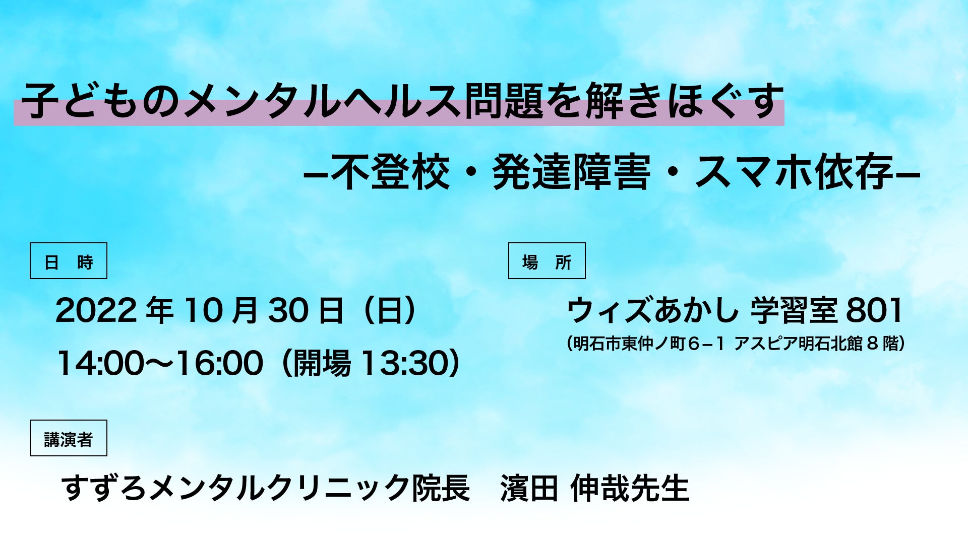 子どものメンタルヘルスに関する講演会を10月30日(日)14時から兵庫県明石市で開催いたします。当日は、すずろメンタルクリニック院長の濱田先生をお招きし、今の子どもたちが抱える問題について心の健康という視点からご講演いただきます。