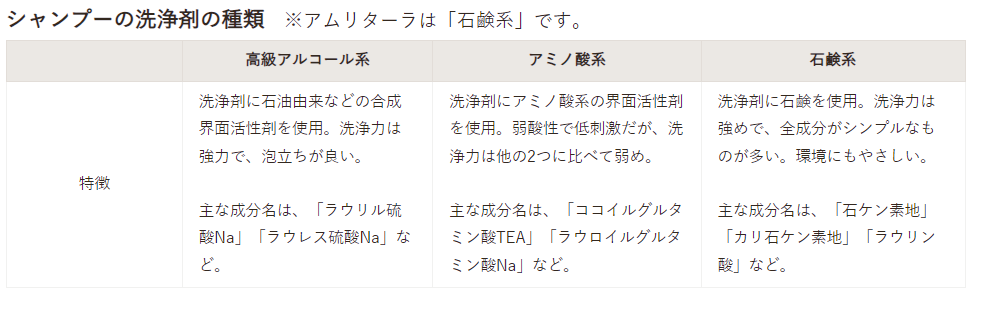 シャンプーの主成分は「洗浄剤」です。洗浄剤の種類は大きく分けて、高級アルコール系・アミノ酸系・石鹸系の3つがあります。その中でも、高級アルコール系に分類される合成界面活性剤は洗浄力が強いものもあり、アムリターラでは頭皮への影響を考えて不使用。