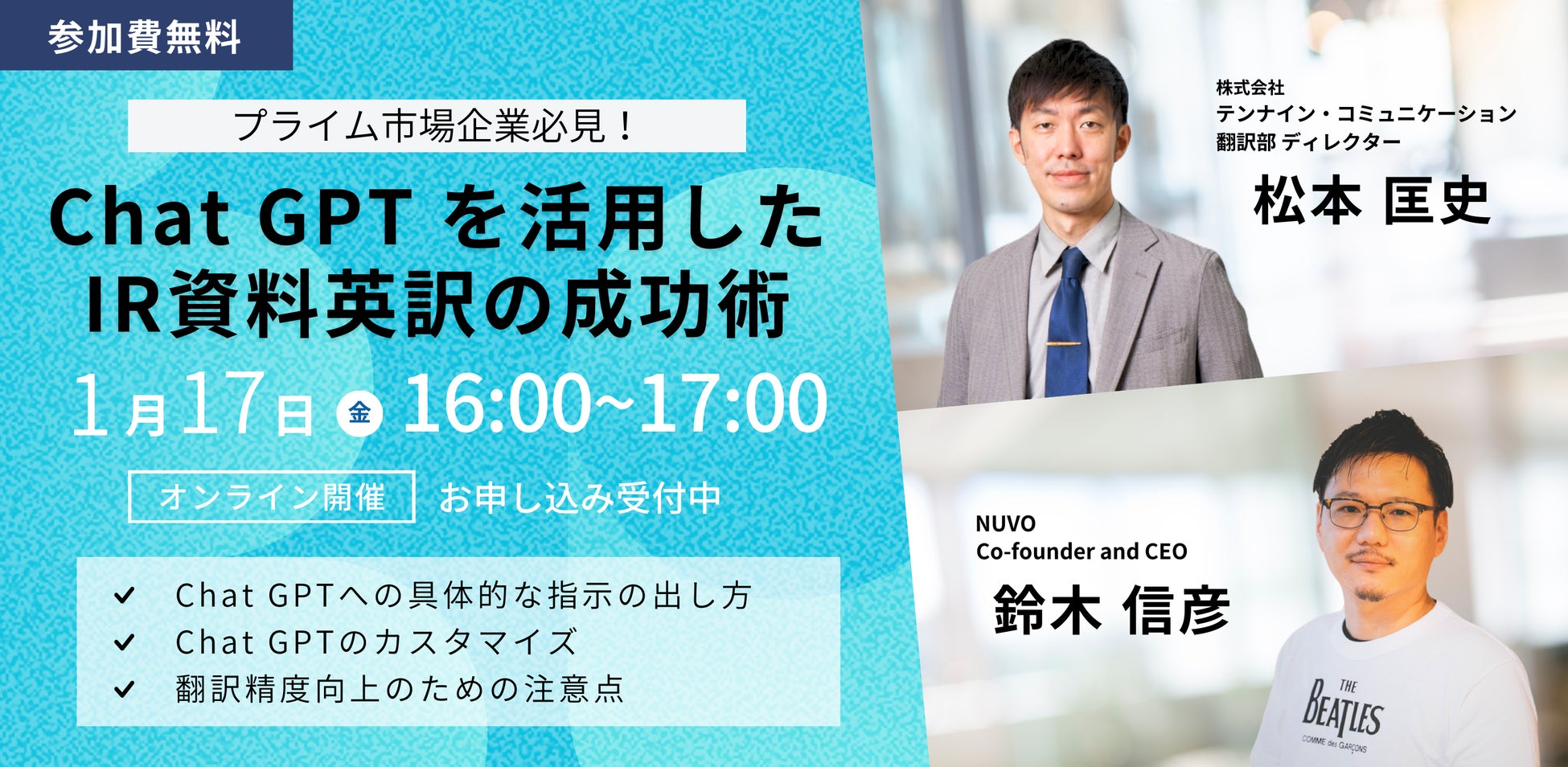 20年に及ぶビジネス通訳・翻訳の豊富な経験を持つテンナイン・コミュニケーションがAI開発者である【NUVO・鈴木氏】をゲストにお招きして、IR資料英訳のためのChatGPT活用術を徹底解説いたします。