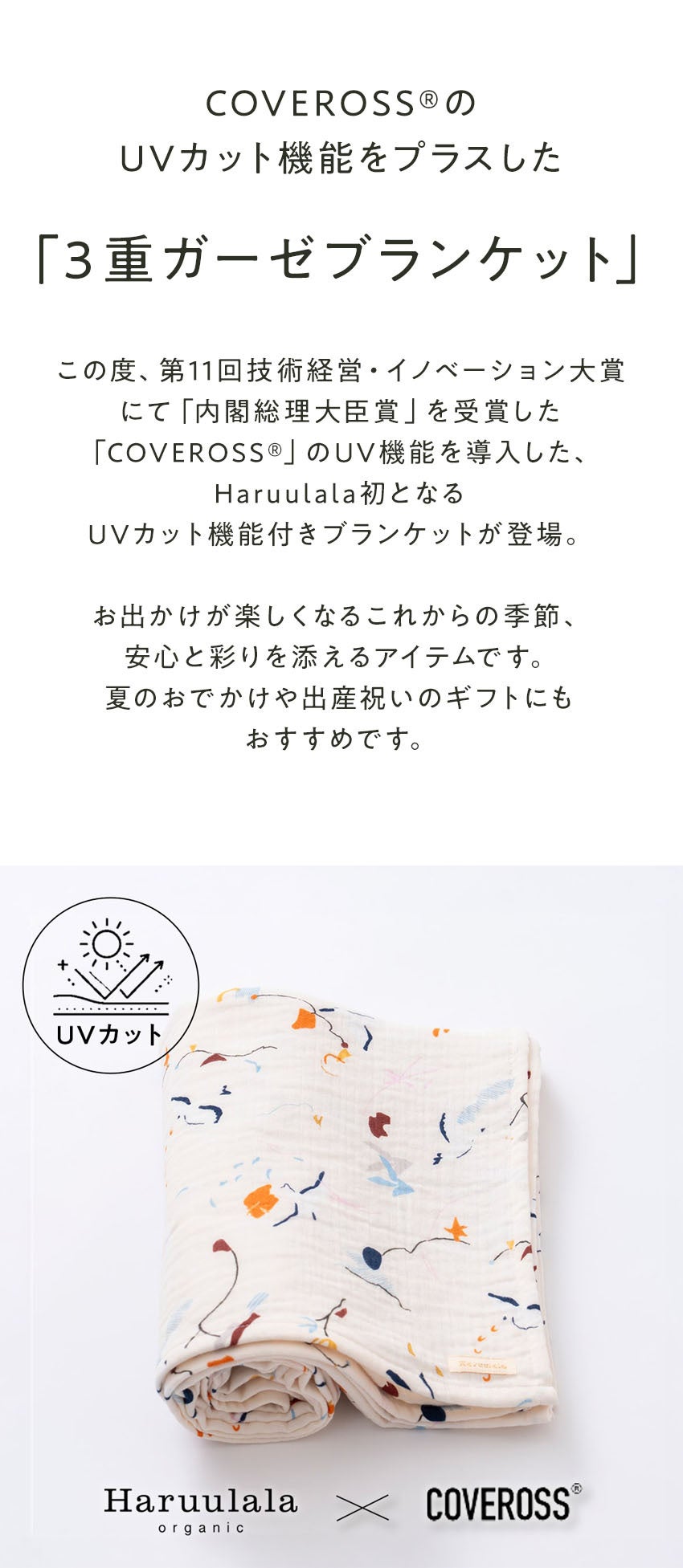 赤ちゃんと地球に優しいオーガニックコットンベビー服を展開する「Haruulala organic(ハルウララ オーガニック)」は、第 11 回技術経営・イノベーション大賞にて「内閣総理大臣賞」を受賞した次世代テキスタイル技術「COVEROSS®(カバロス)」を導入した、ブランド初となる UV カット機能付きブランケットを発売いたします。