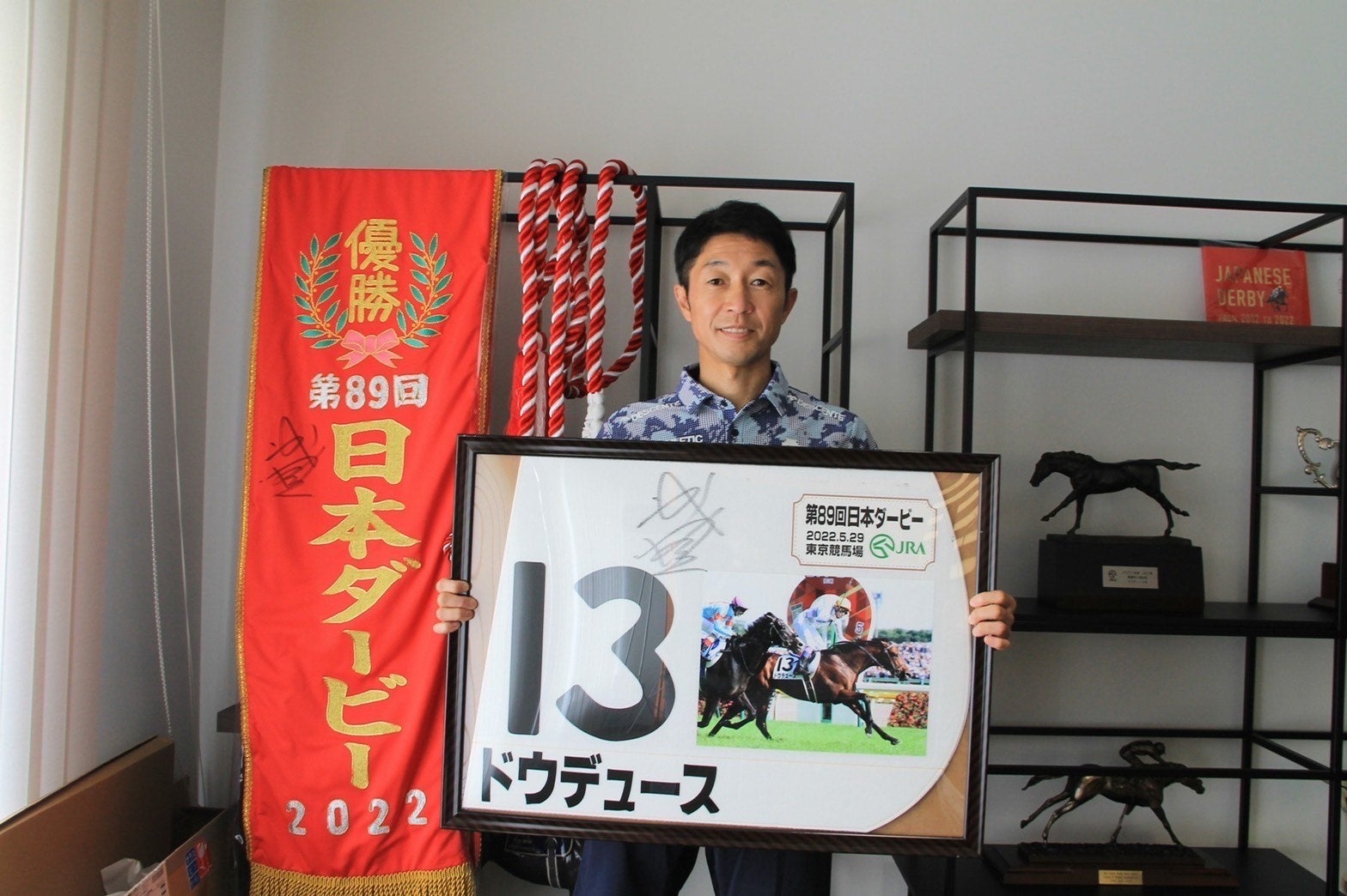 2022年の日本ダービー(G1)を優勝したサラブレッド「ドウデュース」の主戦・武豊騎手のサイン入り優勝ゼッケンレプリカ(2022年日本ダービー)をはじめ有名馬の公式グッズや、日本中央競馬会所属人気騎手の愛用品など計15点