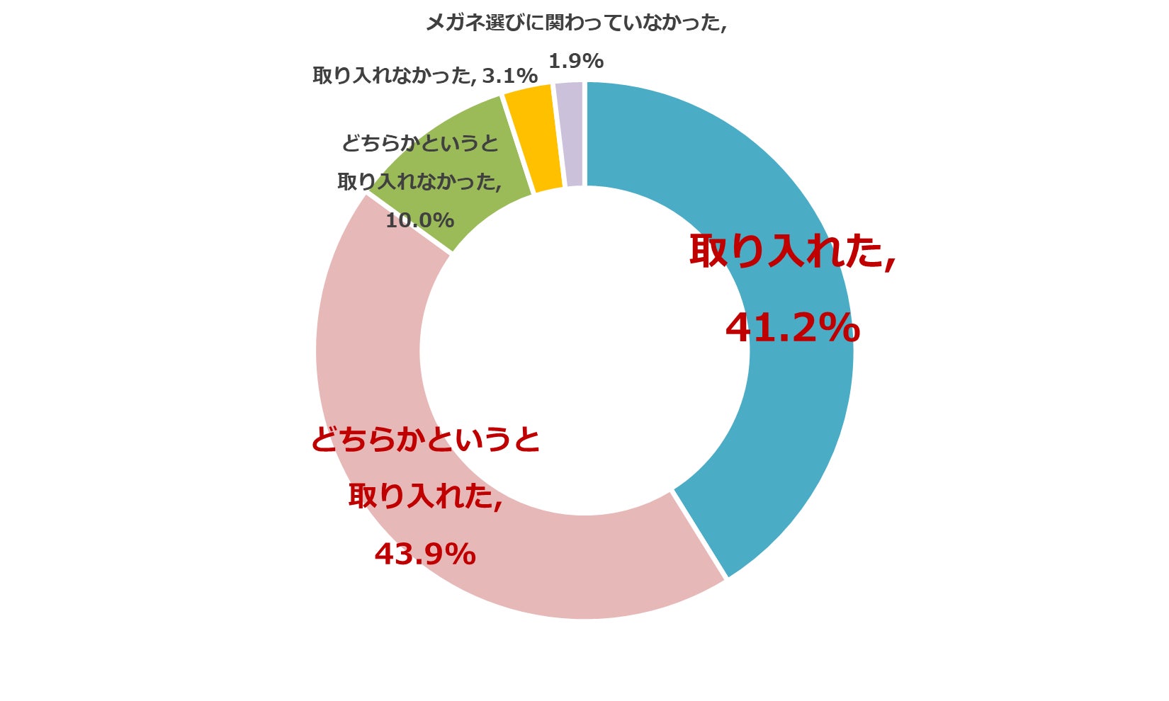 子どもの初めてのメガネを選ぶ際、子どもの意見を取り入れたか質問したところ、85.1%が「取り入れた」(取り入れた:41.2%、どちらかというと取り入れた:43.9%)と回答しました。