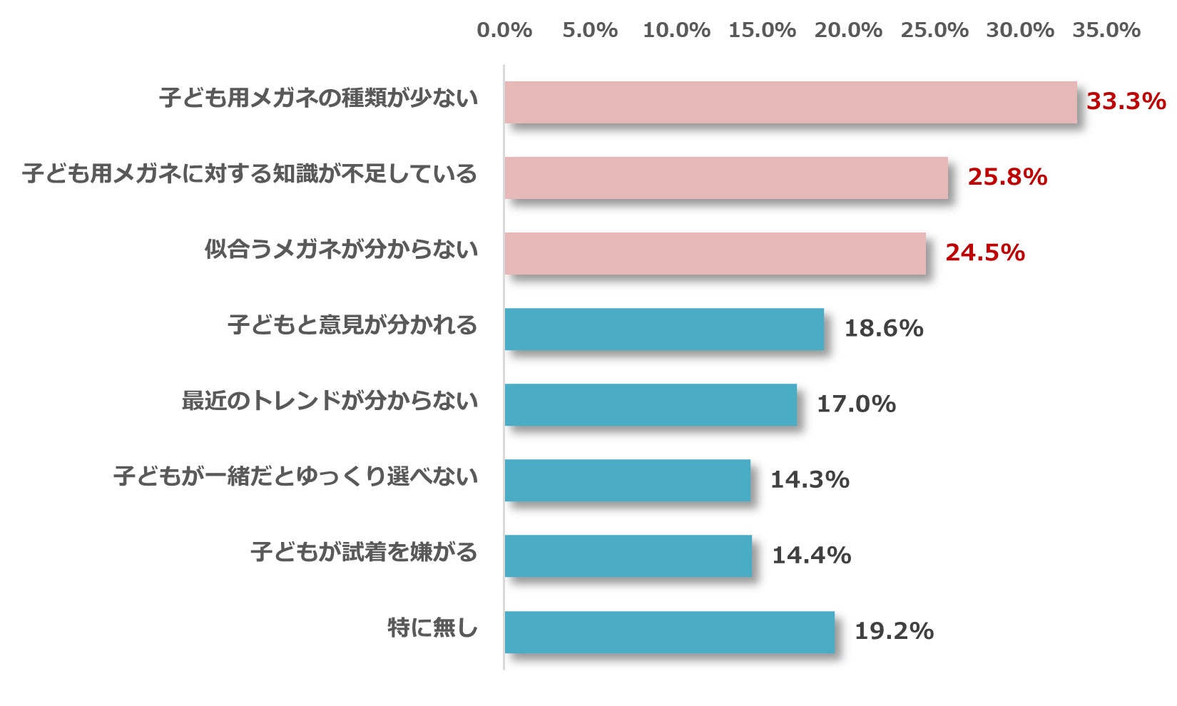 子どものメガネデビュー時に、メガネ選びで困ったことがあったか質問したところ、最多回答は「子ども用メガネの種類が少ない(33.3%)」、次に「子ども用メガネに対する知識が不足している(25.8%)」、「似合うメガネが分からない(24.5%)」と続きました。