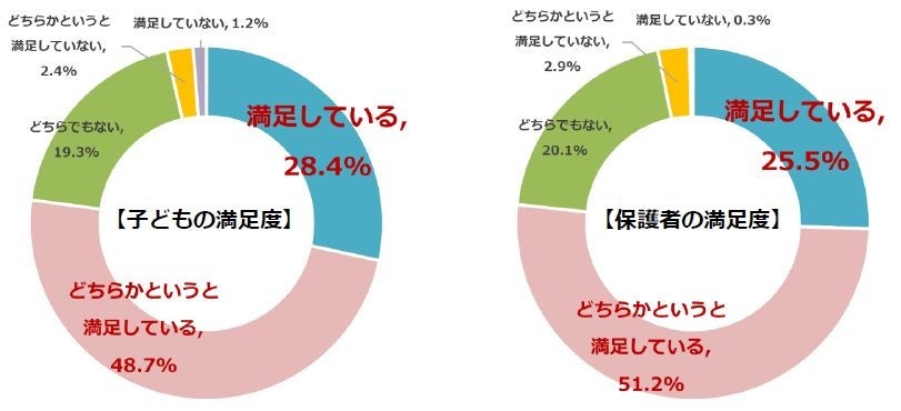 メガネを掛けている小学生の保護者750名を対象に、初めて購入した子どものメガネに満足しているか質問したところ、子どもの77.1%が「満足している」(満足している:28.4%、どちらかというと満足している:48.7%)、保護者の76.7%が「満足している」(満足している:25.5%、どちらかというと満足している:51.2%)と回答しました。
