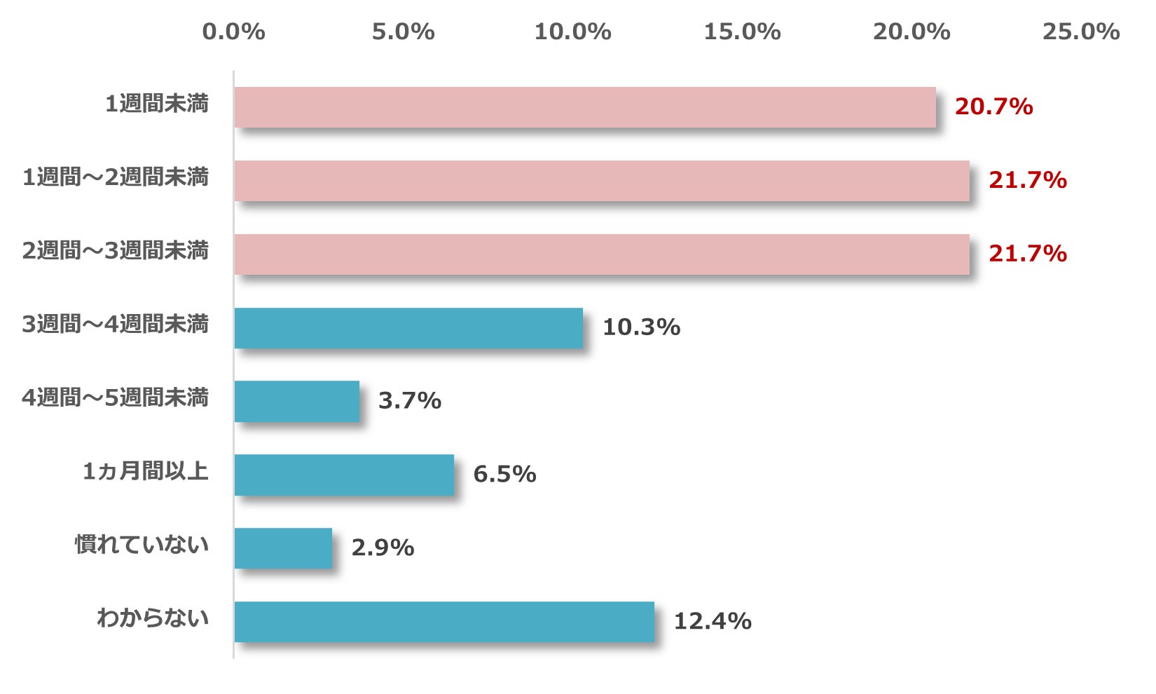 子どもがメガネデビュー後、メガネの装着に慣れるまでどのくらいの期間がかかったか質問したところ、最多回答は「1週間~2週間未満(21.7%)」、「2週間~3週間未満(21.7%)」、次に「1週間未満(20.7%)」と続きました。この結果、6割以上の子どもが、メガネデビューから3週間以内にメガネに慣れていることが分かりました。