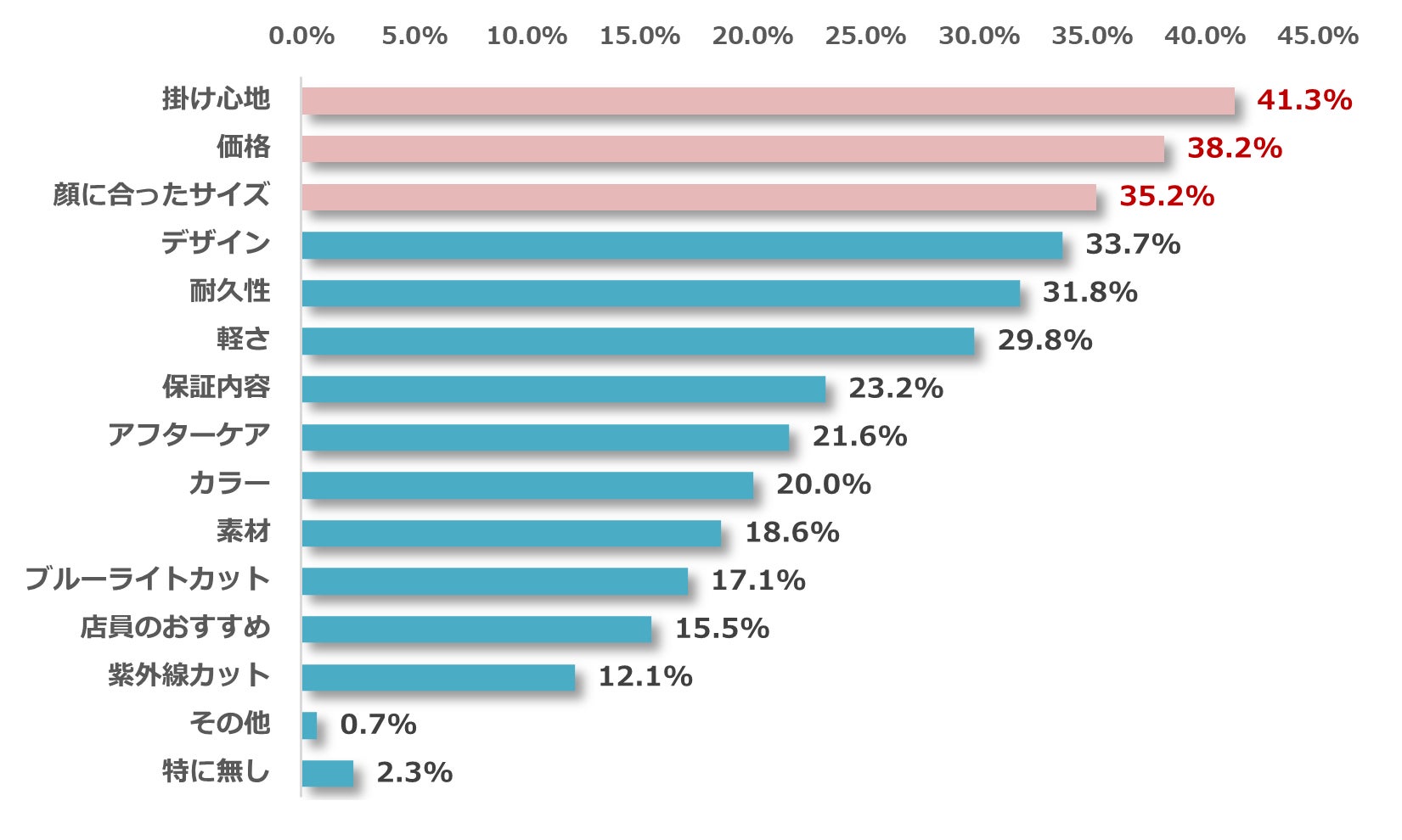 メガネ選びで重要視するポイントで、保護者の回答で最も多かったのは、「掛け心地(41.3%)」、次に「価格(38.2%)」、「顔に合ったサイズ(35.2%)」という結果でした。