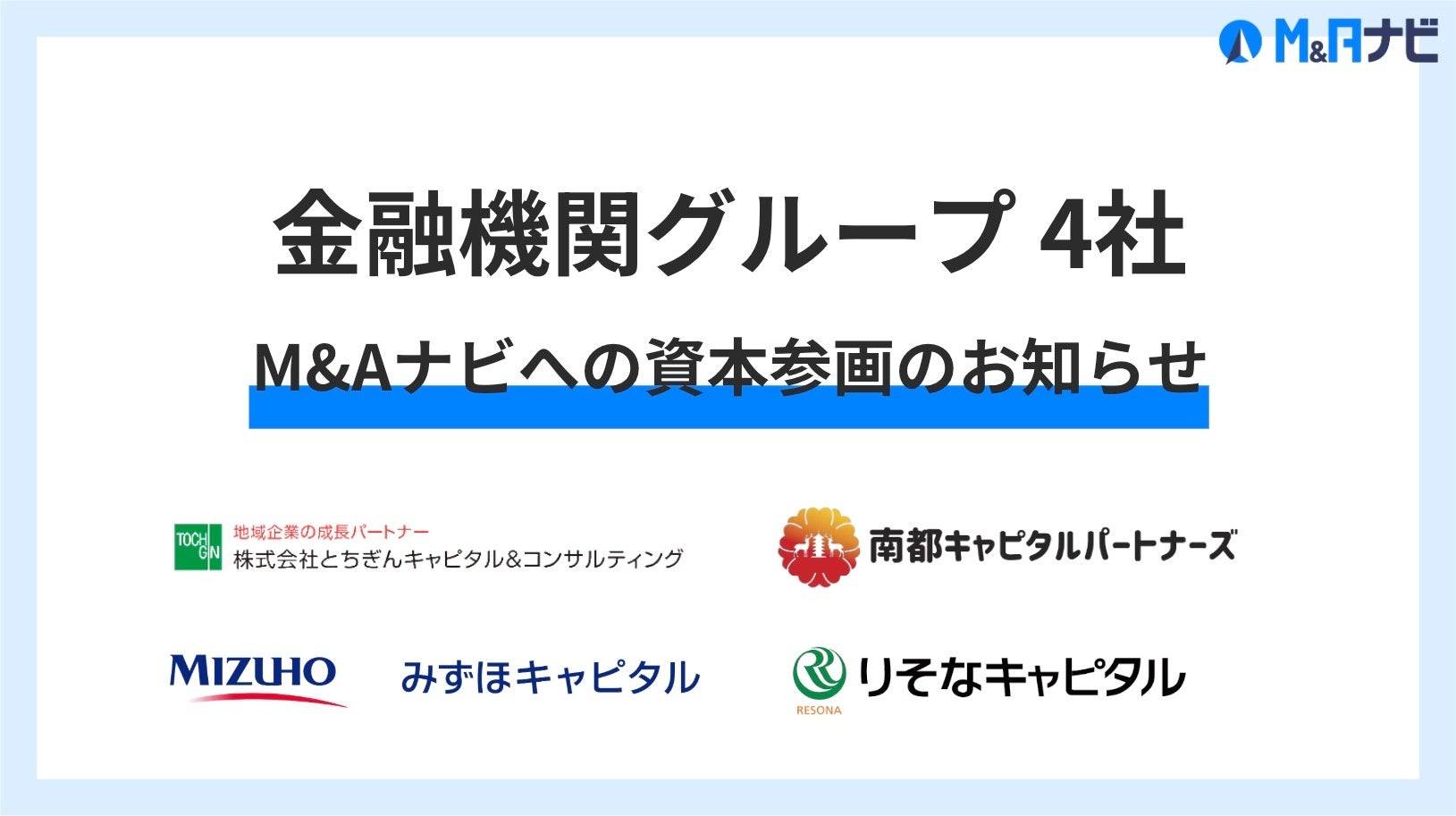 M&Aテックで事業承継問題に挑む株式会社M&Aナビ(本社:東京都渋谷区、代表取締役:瀧田雄介)は、とちぎんキャピタル&コンサルティング、南都キャピタルパートナーズ、みずほキャピタル、りそなキャピタル(※)の4社が新規株主として参画したことをお知らせいたします。今回のパートナーシップの強化によって、金融機関との連携を一層深め、全国の中小企業へ事業承継支援が行き渡る社会を目指します。(※五十音順)