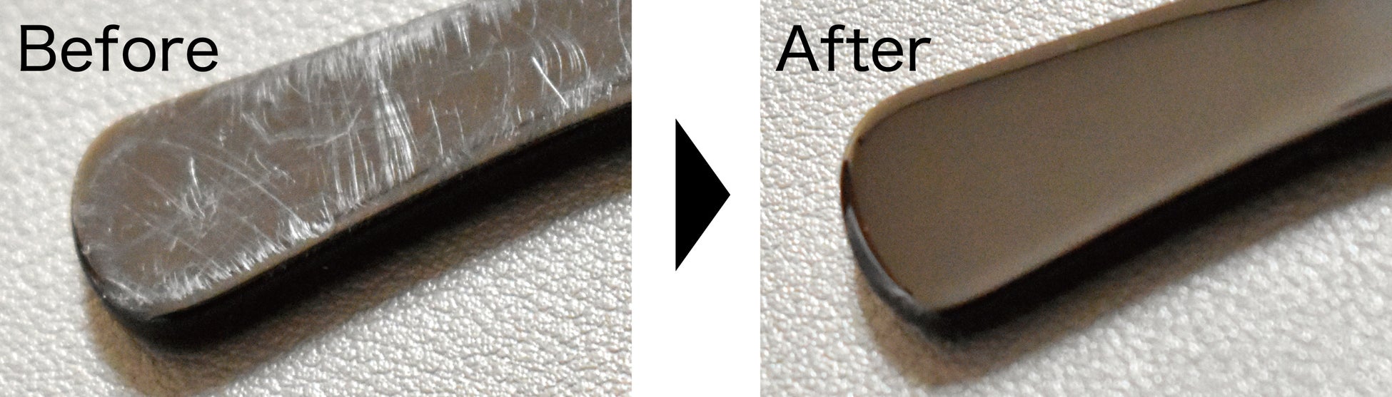 ご提供内容: クリーニング、型直しなどのほか、必要に応じて、フレーム磨き(写真例/プラスチック製フレームにできたスリ傷などを再度磨き上げてツヤを取り戻す)、再メッキ加工(メタル製のフレームの塗装がはげてしまったところを再塗装)など、通常は有料でご提供しているメニューも無料で提供いたします。