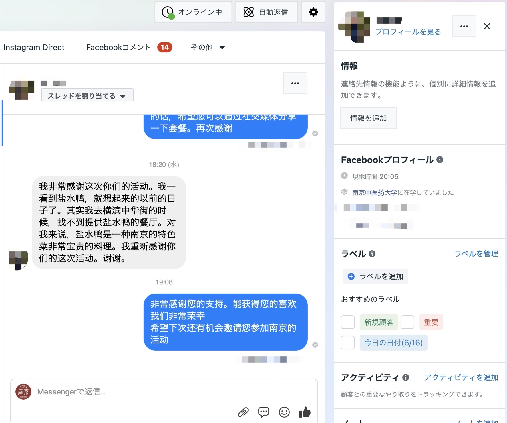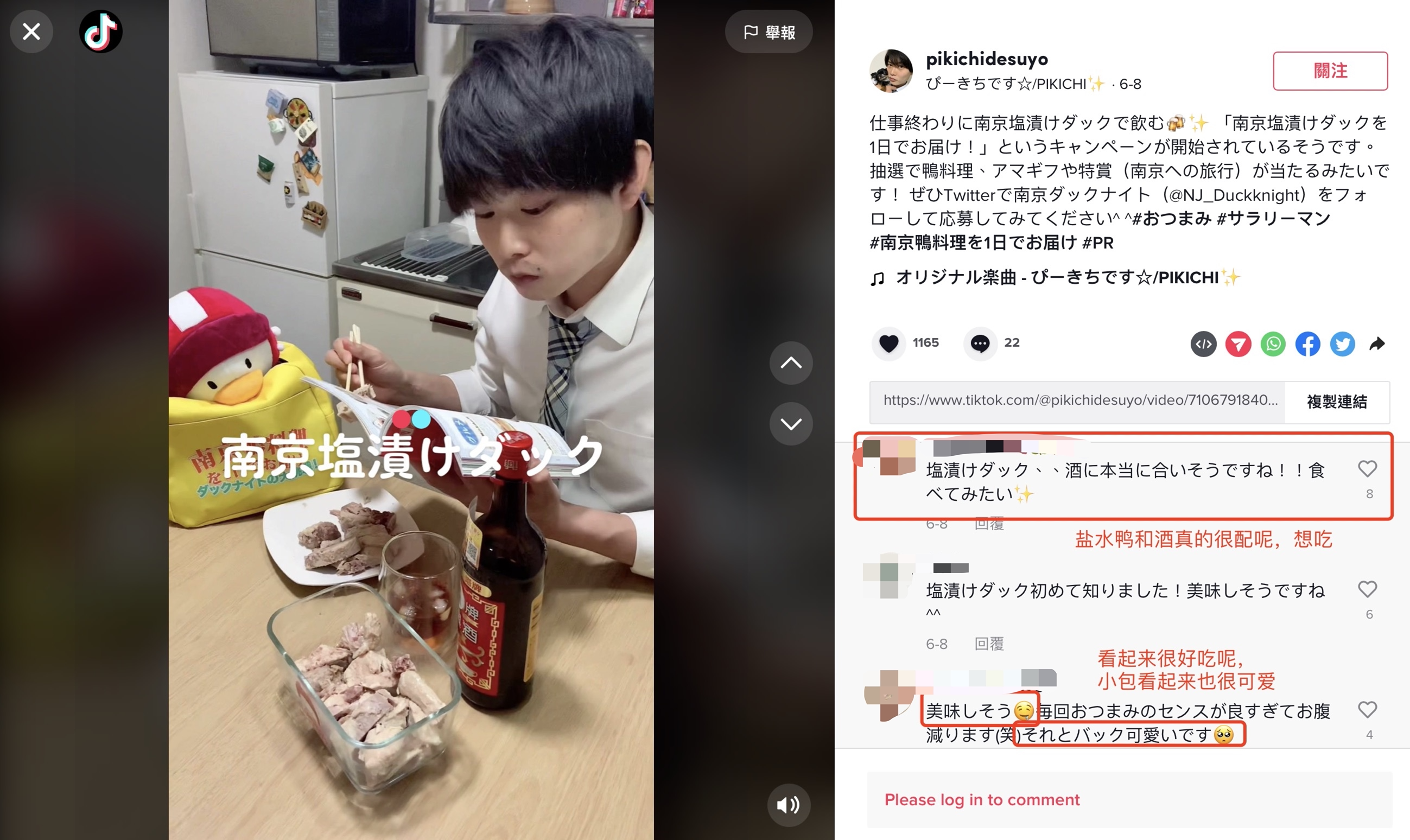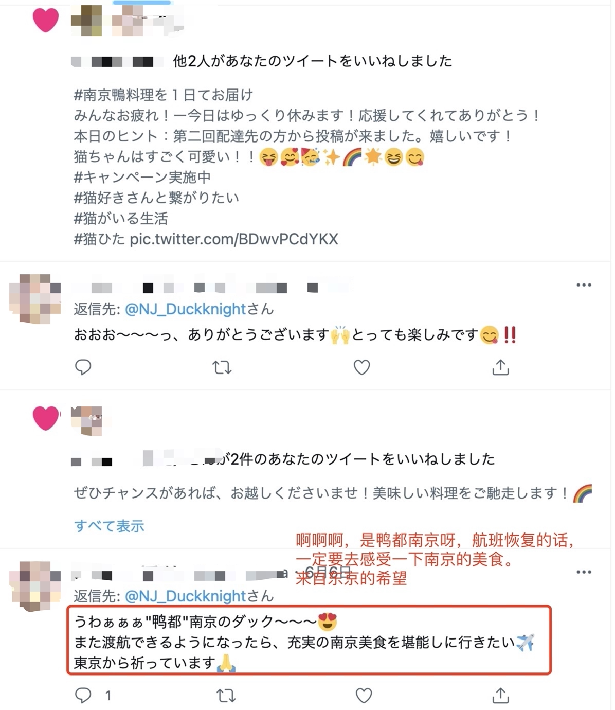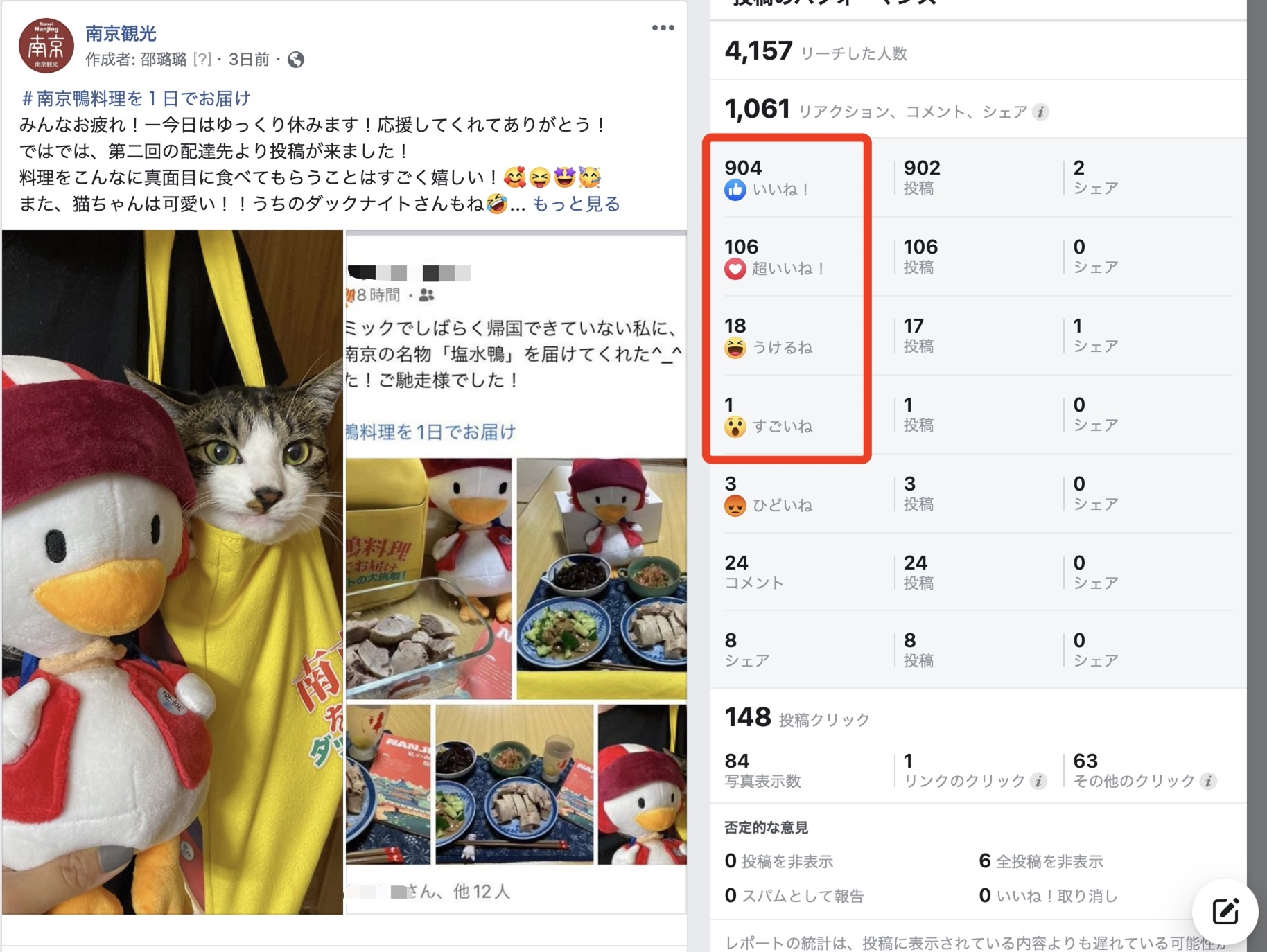 準備段階のお客様募集からイベント期間中の配送まで、毎日、南京観光の日本語のFacebookアカウントとTwitterアカウントでネットユーザーと交流し、日本のグルメ・インフルエンサーの方と試食動画のコラボを行いました。現在までにこのイベント関連の投稿では1万回近くネットユーザーからいいねとコメントをいただいており、動画はアップロードしてから1週間で、再生数が10万回を突破しました。それだけでなく、各注文者の方々もSNSを通じてご自分の感想を積極的にシェアしてくださり、南京と南京鴨は共に「ネット上の人気者」となることができました。