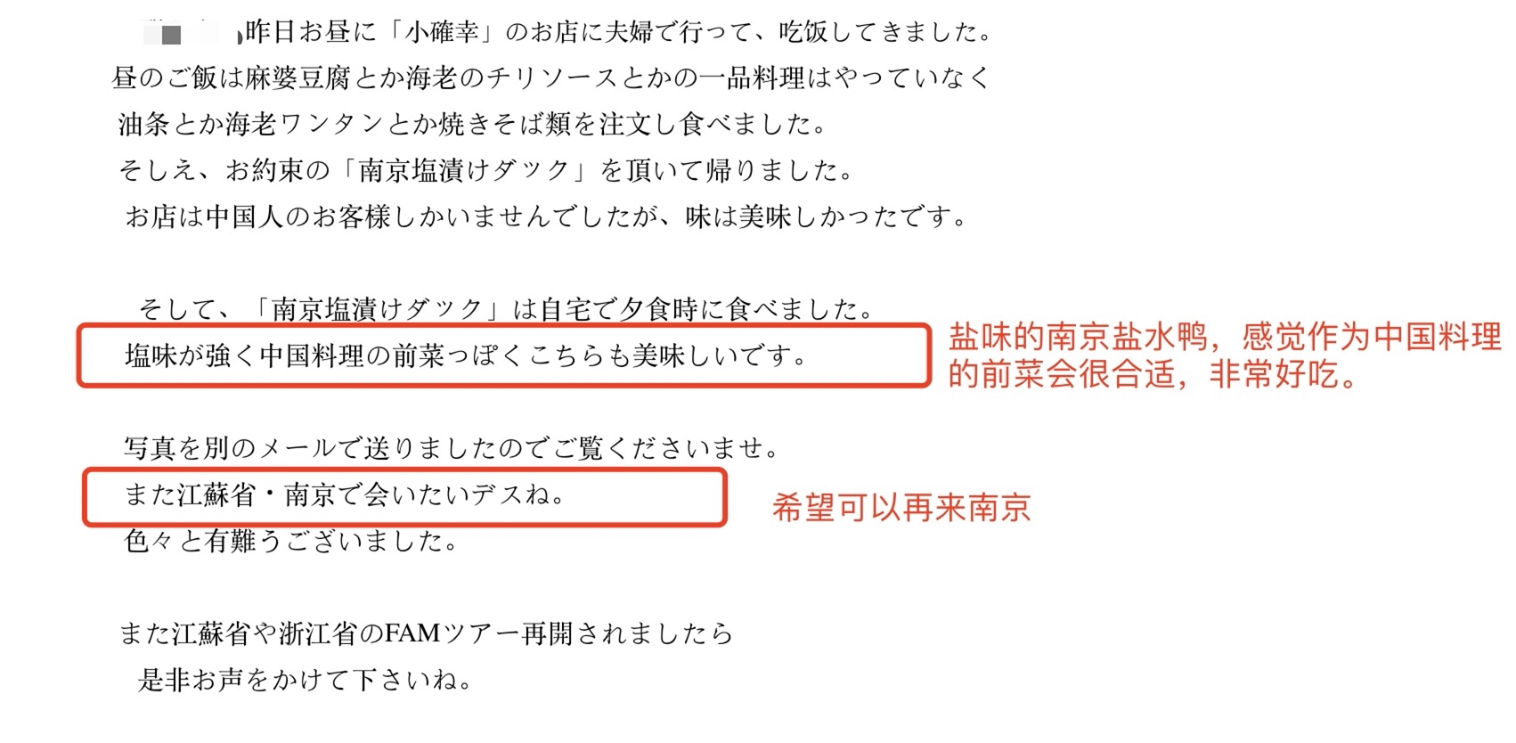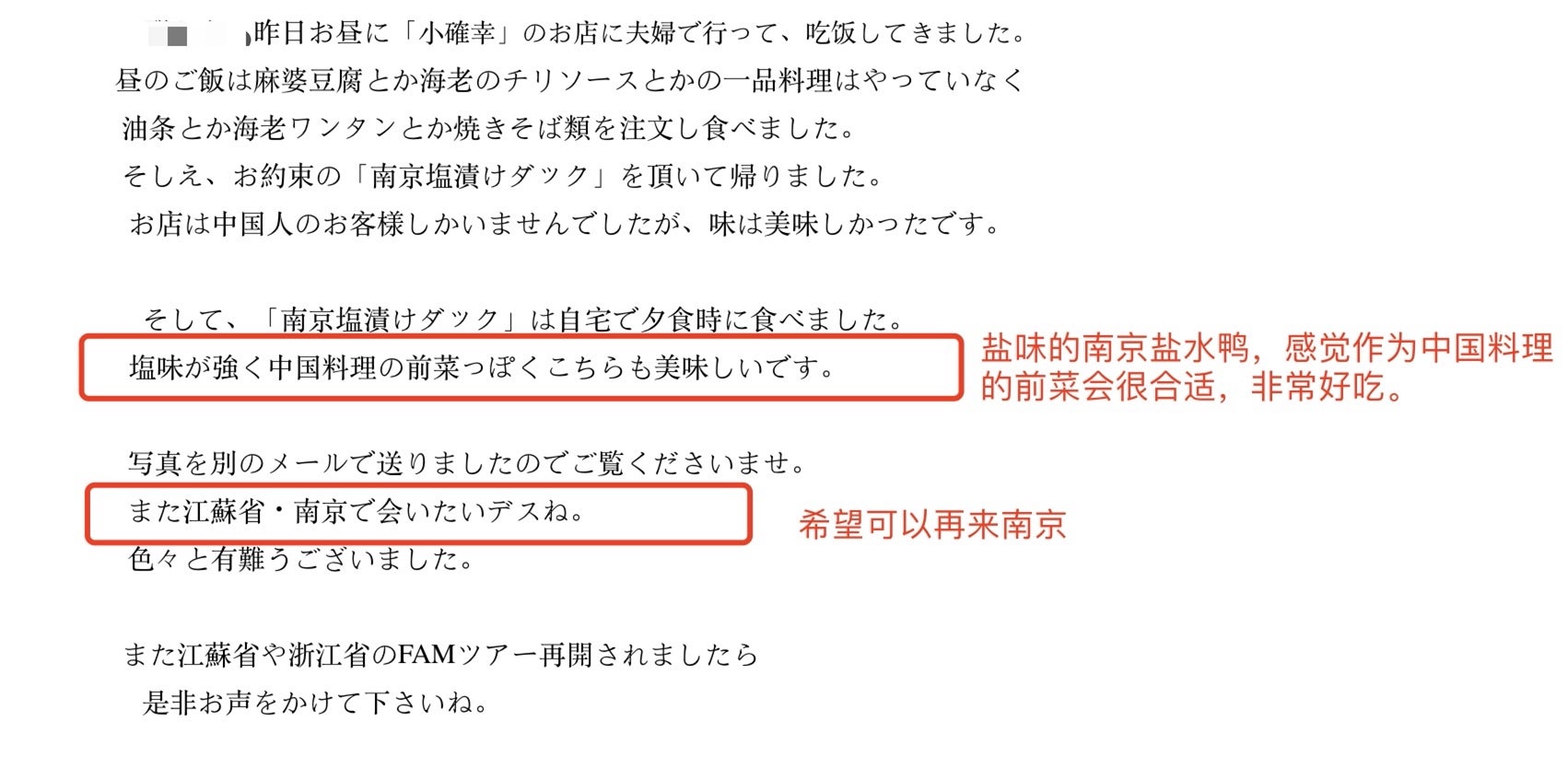 今回のイベントは日本でネットユーザーからの幅広い注目を集めただけでなく、旅行業界の方々からのサポートを受けることもできました。日本の旅行業者・メディア関係者との連携を強化するため、この機会を利用して、日本の旅行業者およびメディア関係者に南京塩漬けダックのお試しクーポンをお配りして好評を博したとともに、それらの方々から将来への期待もまた寄せられました。旅行業者を代表して池内氏は、日本で「南京に会えて」とても嬉しかったこと、そしてできるだけ早く渡航が回復し、南京を訪れる時が来てほしいと話されていました。