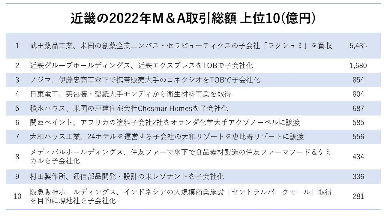 2位以下は、近鉄グループホールディングス(大阪府)が、近鉄エクスプレスの完全子会社化を目的に最大1680億円を投じてTOB(株式公開買い付け)を実施すると発表した案件。ノジマが伊藤忠商事(大阪府)傘下の携帯販売大手コネクシオに対して、完全子会社化を目的に最大854億9300万円を投じてTOBを実施すると発表した案件が続きました。
