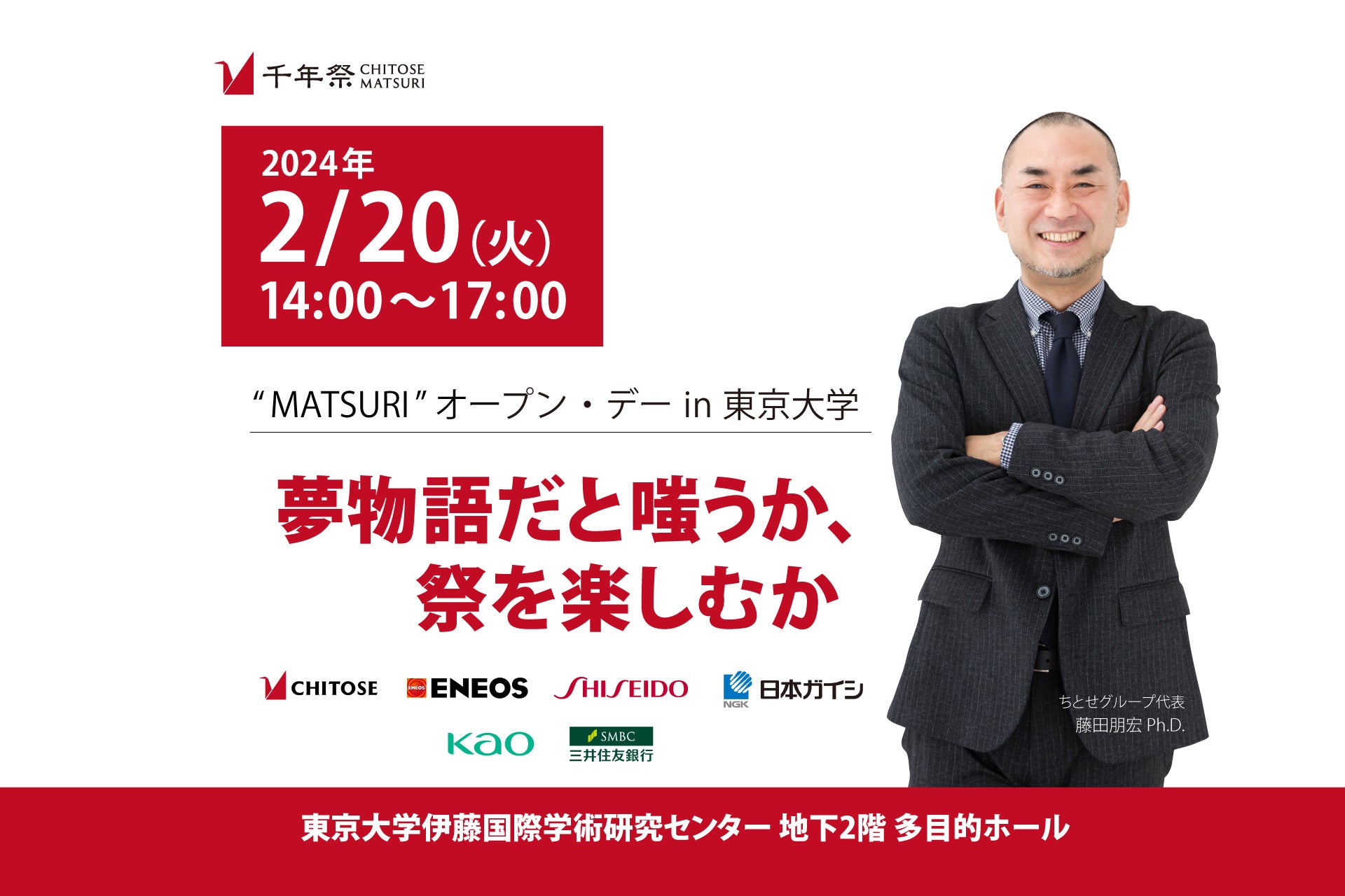 藻類産業を構築するプロジェクト「MATSURI」を運営するちとせグループは、2024年2月20日(火)に東京大学にて、業界研究イベント「”MATSURI” オープン・デー in 東京大学」を開催いたします。本イベントには出展企業としてENEOS株式会社、株式会社資生堂、日本ガイシ株式会社、花王株式会社、株式会社三井住友銀行が参加いたします。藻の未来や可能性、環境問題の本質的なソリューションについて理解を深めたい方、ご自身の学びを社会に還元したいとお考えの方、幅広い層の皆さまのご来場をお待ちしております。