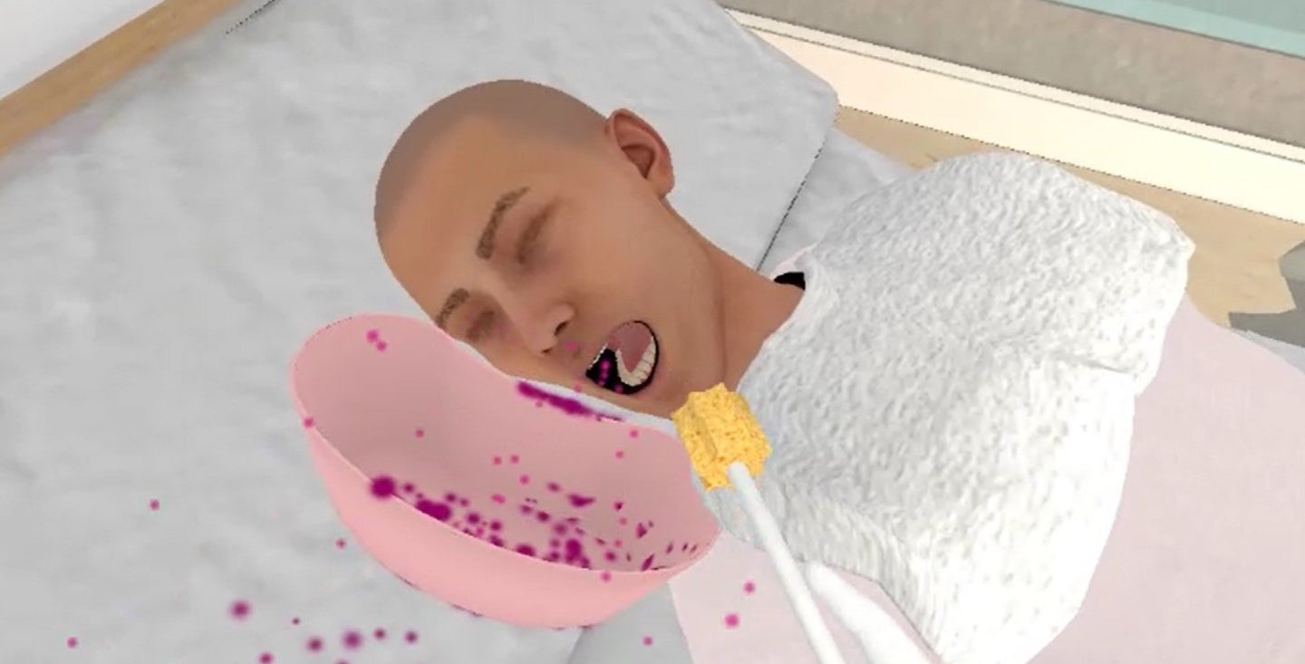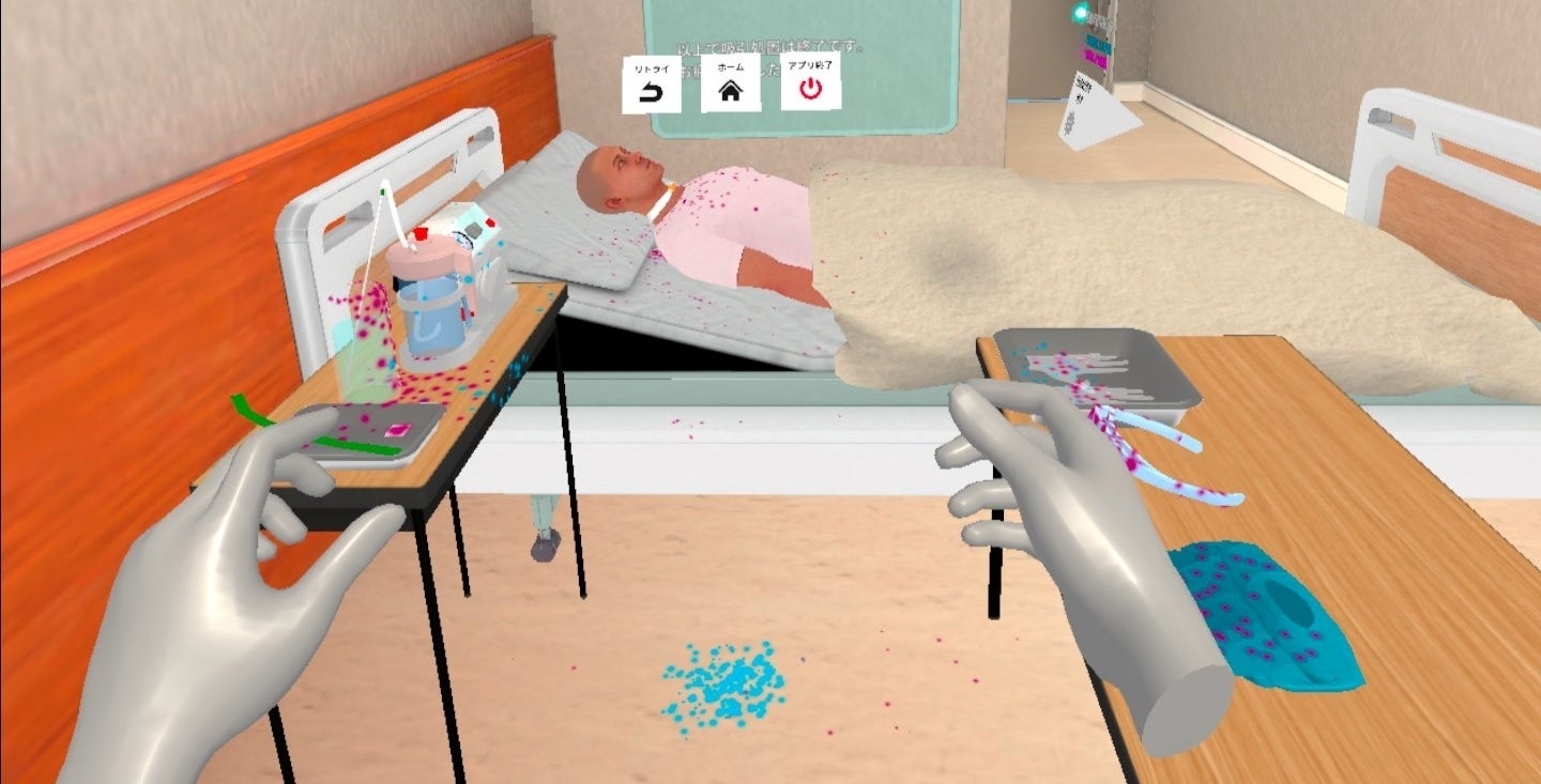 嘔吐処理、口腔ケア、吸引操作による汚染の拡がりを意識しながらバーチャル上で看護技術のトレーニングができます。
