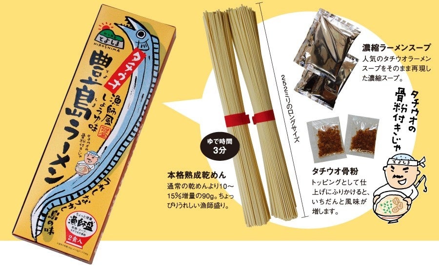 瀬戸内海のど真ん中、安芸灘諸島に浮かぶ、古くから漁業の盛んな漁師の島『豊島(とよしま)』。なかでもタチウオの一本釣りが有名です。身綺麗なタチウオの一夜干しからつくられた骨粉が、この商品開発の初めの第一歩でした。この骨粉を活かした"秘伝"太刀魚出汁と醤油の旨味を合わせ、あっさりとしたスープに仕上げてあります。老若男女どなたのお口にも合う、ちょっと懐かしい味わいのラーメンです。