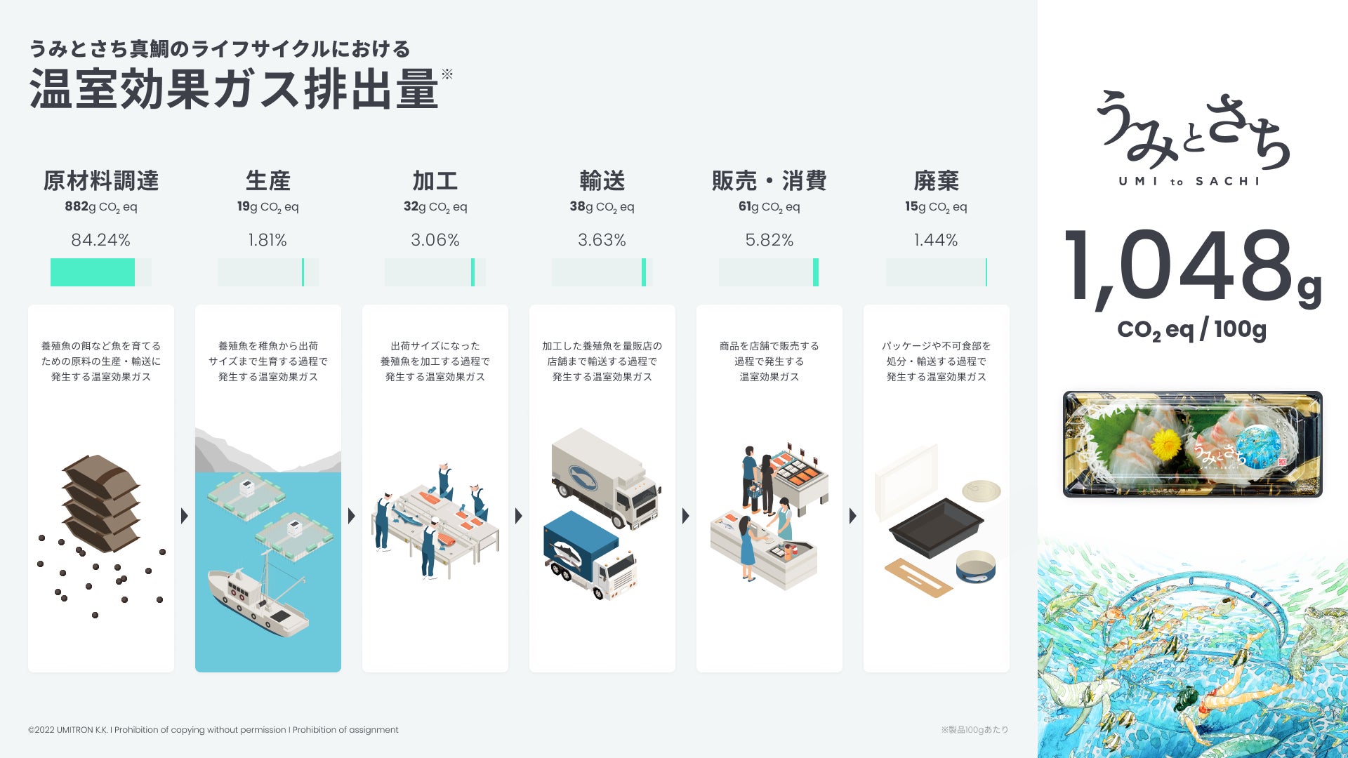 今後ウミトロンは、養殖魚の生産現場の効率化・省力化のみならず、温室効果ガス排出量削減にも貢献可能な技術開発をさらに進めていきます。また、今回実施したライフサイクルアセスメント分析の結果、及びスマート給餌機「UMITRON CELL」搭載のAIによる温室効果ガス排出量削減効果を元に、消費者向けに温室効果ガス削減効果を表示した養殖魚販売にも取り組む予定です。生産現場だけでなく、消費者が地球温暖化防止に向けて購買という身近なアクションをとれるよう後押しすることで、気候変動対策、脱炭素社会の実現に向けて貢献していきます。