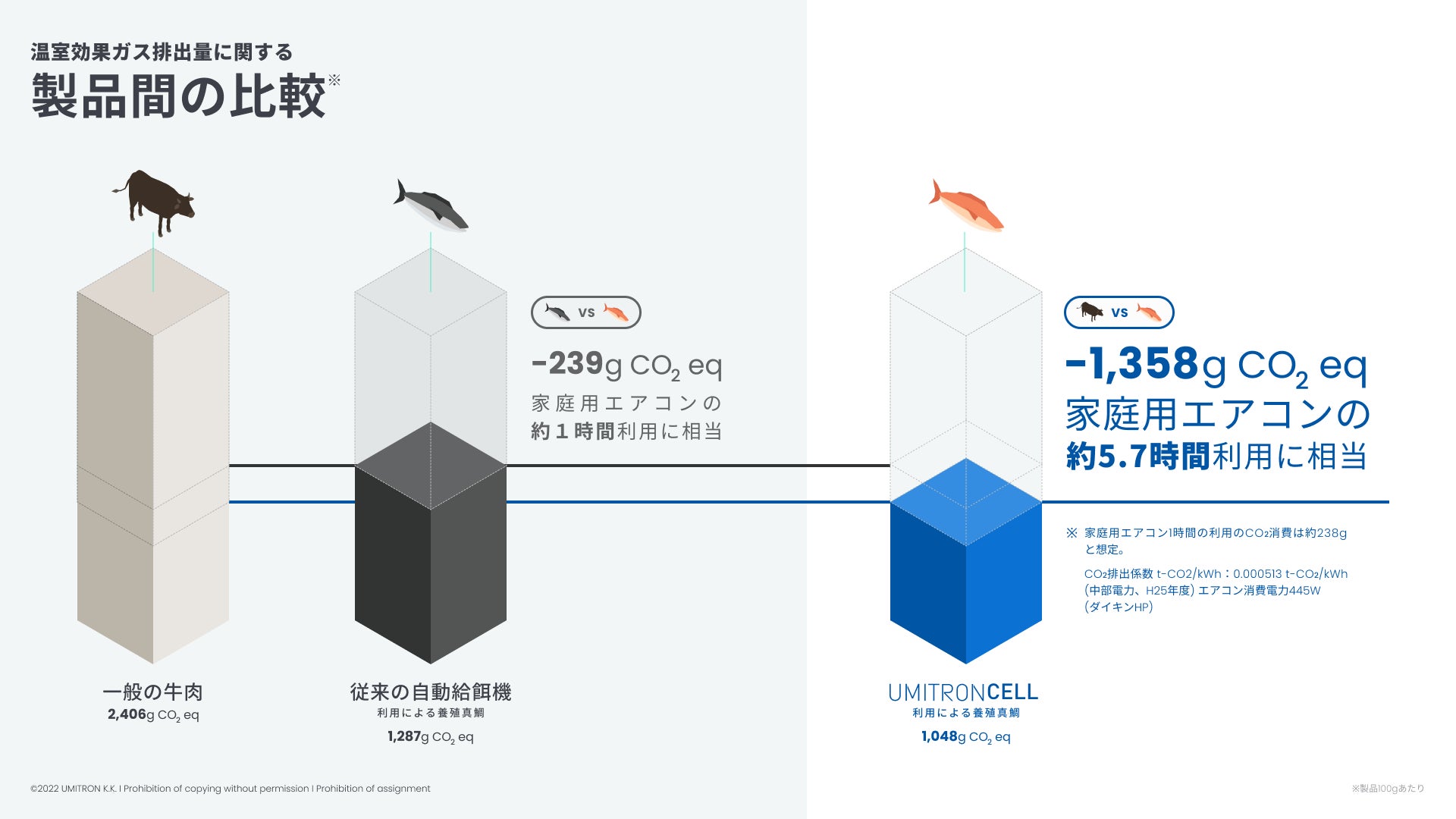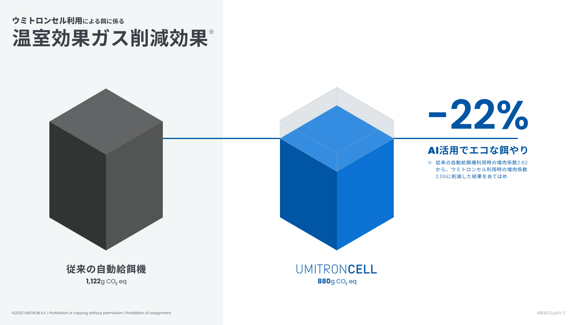ウミトロン、AI搭載スマート給餌機「UMITRON CELL」による飼料関連の温室効果ガス排出量削減効果を発表。従来の自動給餌機比約2割の温室効果ガスを削減。