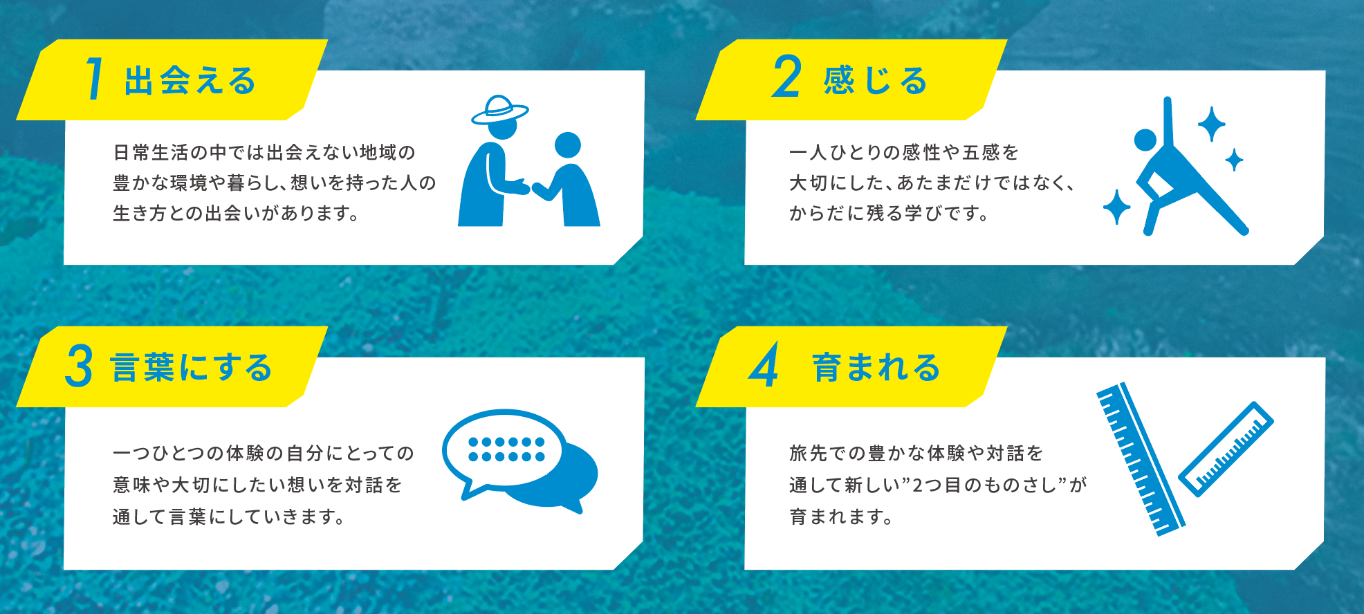 2) 旅先でしかできない出会いや体験のデザインと、一人ひとりの感性や価値観を大切にした対話的な学びを重視します。