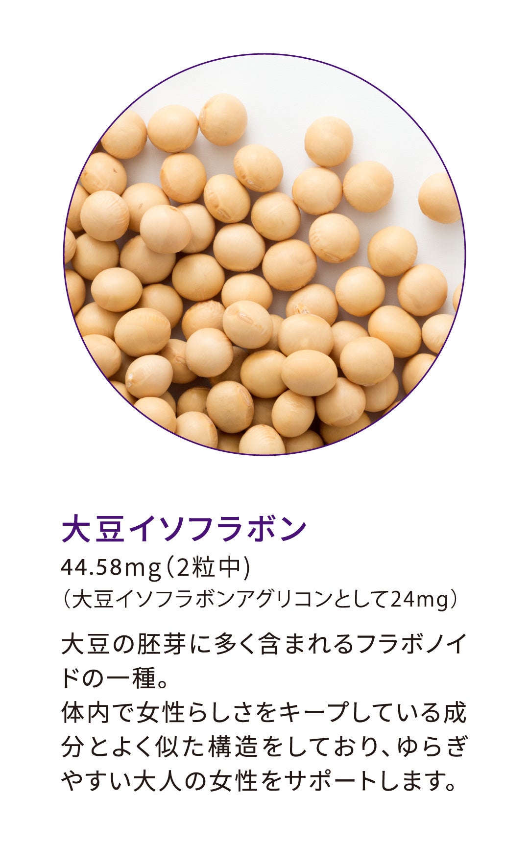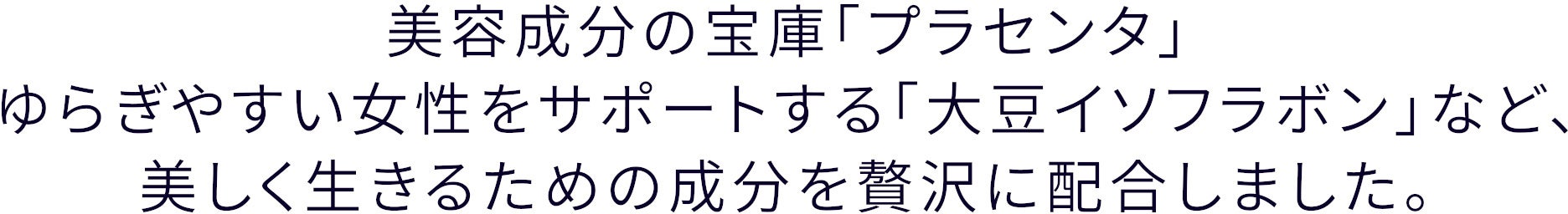 豊富な美容成分をたっぷり含んだ「プラセンタエキス」、ゆらぎがちな毎日をサポートする「大豆イソフラボン」など、女性の健やかな美しさを考えた成分を厳選して配合しました。