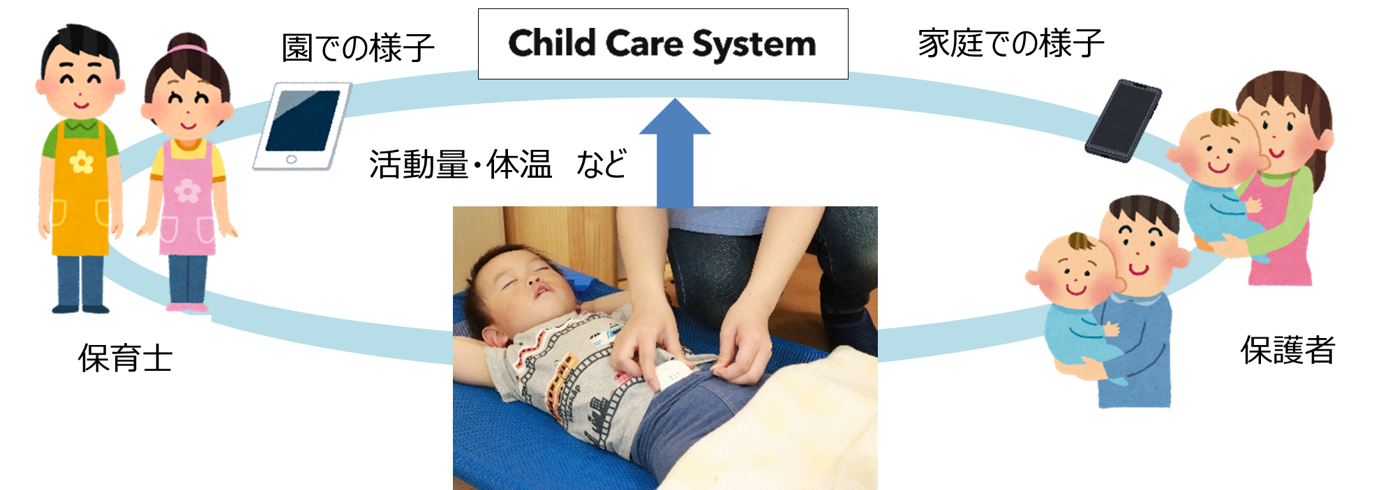 チャイルドケアシステム(CCS:Child Care System)とCCSセンサーを活用して、乳幼児の睡眠状態や皮膚表面温度の変動状態を把握します。乳幼児の正確な睡眠状態を保護者・保育士が把握・共有して、乳幼児にとっての良質な睡眠環境へつなげます。その結果、乳幼児突然死症候群(SIDS)の回避や、保育士の経験や能力に左右されにくい、質の高い保育サービスへつなげます。