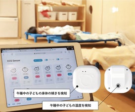 CCSセンサーは、保育施設におけるお昼寝時に、園児のおむつに装着して、体の向きを検知します。乳幼児突然死症候群(SIDS)のリスクが高いとされるうつぶせ寝を検知して保育士に知らせるほか、体の向きやお腹の皮膚温度を断続的に記録します。