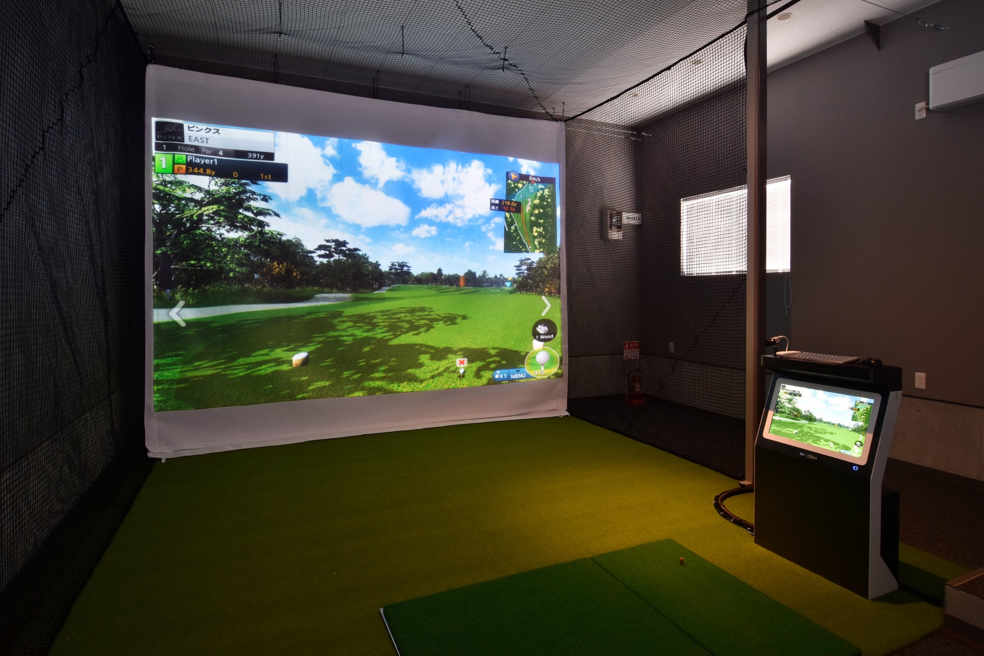 事務所横の空きスペースに設置したイナバガレージの内部では、高さ 約3.4m 幅 約4mの空間でシミュレーションゴルフを楽しむことが出来ます。ユアサ商事とHOUSEIで、約1年間構想を練り完成させました。HOUSEIは、シミュレーションゴルフ機器・防球ネット・予約システム・顔認証システムを担当いたしました。設置期間は約1.5か月と、短期間で完了することが可能です。