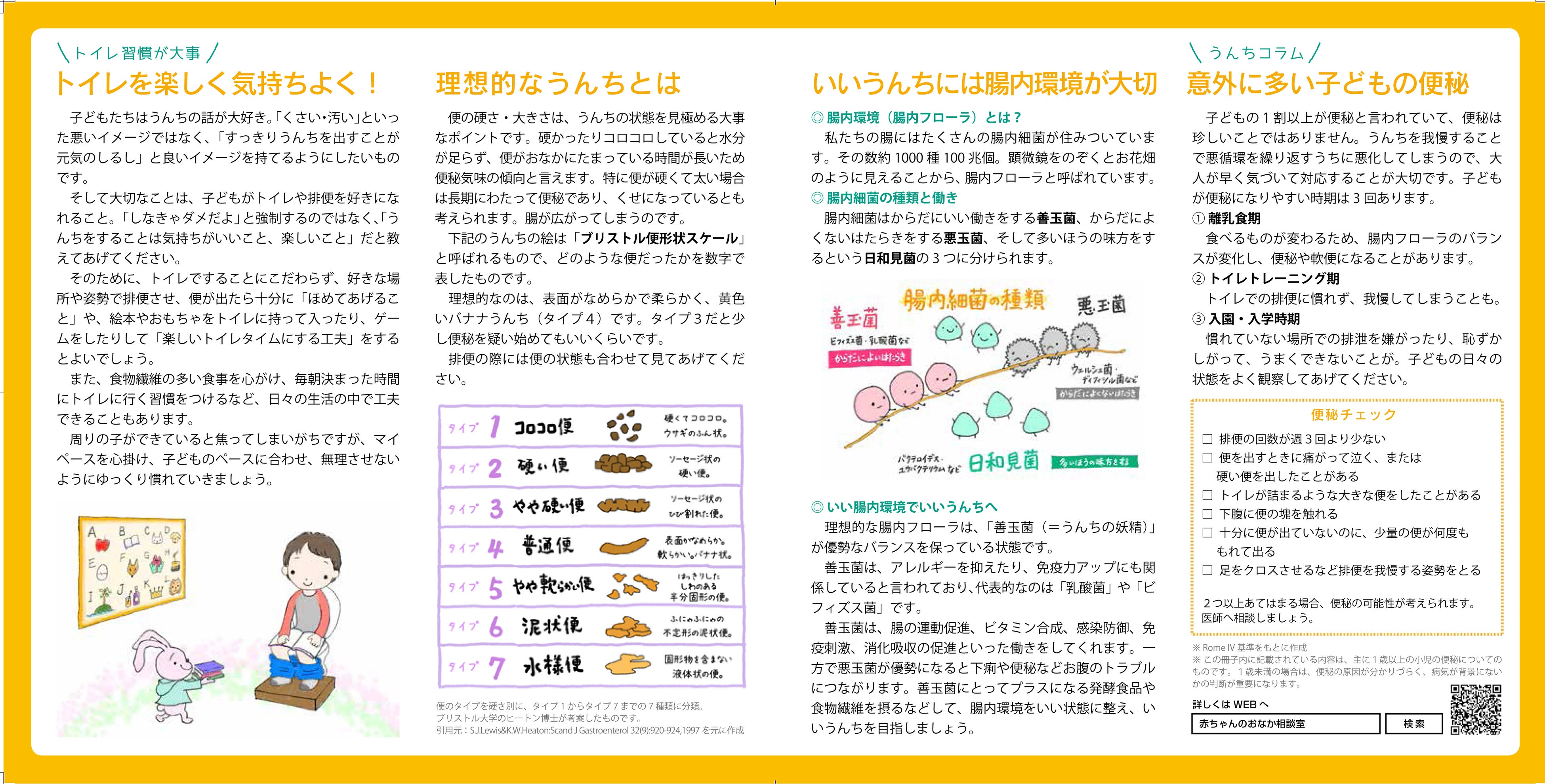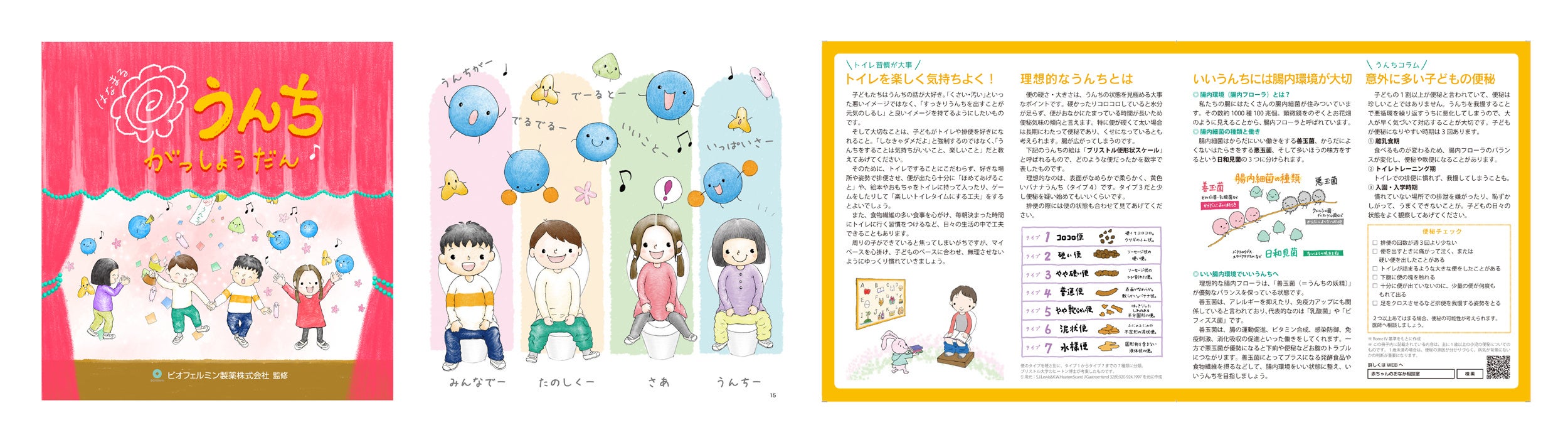 ビオフェルミン製薬は、1歳から3歳児を対象に、子どもの成長過程において欠かせない「トイレトレーニング」をテーマにした絵本「はなまる うんちがっしょうだん」(非売品)を2020年7月に制作しました。トイレトレーニングの第一歩は、子どもがトイレや排便を好きになること。そこで、子どもにまず「排便は気持ちがいいこと、楽しいこと」というイメージを持ってもらえるような楽しい絵本としました。巻末ページでは、親御さんに向けて、トイレ習慣の大切さや子どもの便秘対策をわかりやすく解説しています。