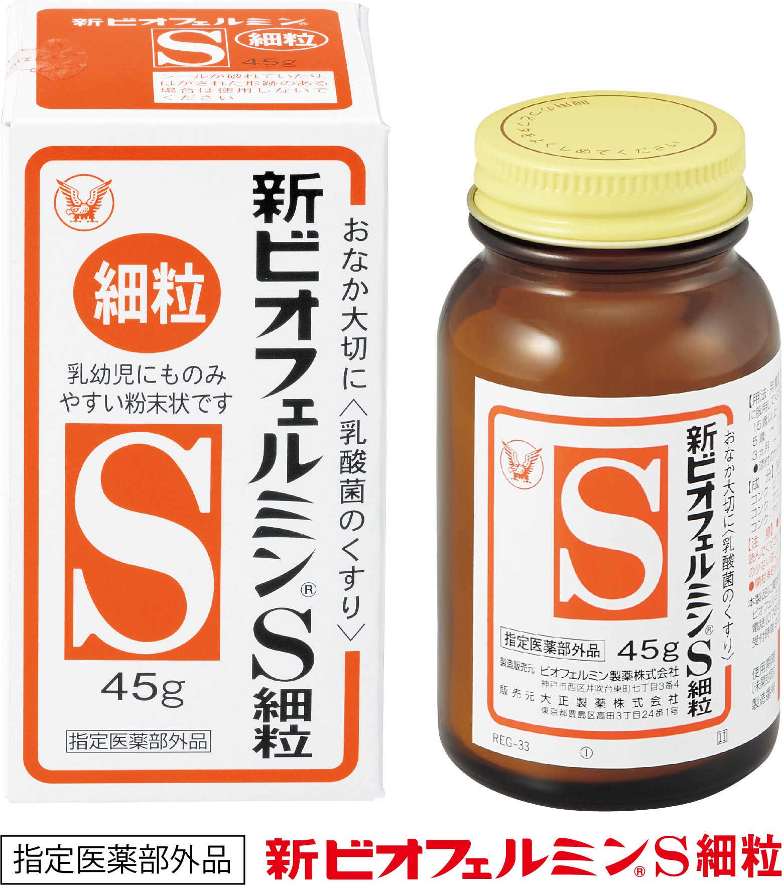 本製品はわずかに甘みがあり、飲みやすい細粒タイプで、生後3ヵ月の赤ちゃんからお年寄りまで家族でお使いいただけます。乳酸菌が小腸から大腸まで幅広く腸の調子を整え、うんちが硬くなる便秘にも、柔らかくなる軟便にも効果を発揮します。5歳以上は同じ有効成分の錠剤タイプ「新ビオフェルミン®S錠」もあります。