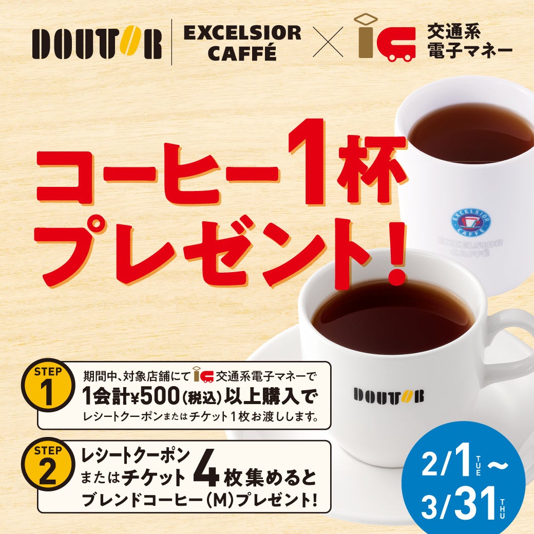 2月1日(火)から3月31日(木)の期間中、全国のドトールコーヒーショップ・エクセルシオール カフェにおいて、交通系電子マネーを1会計500円(税込)以上、合計4回ご利用いただくと、コーヒー1杯をプレゼントするキャンペーンを実施します。