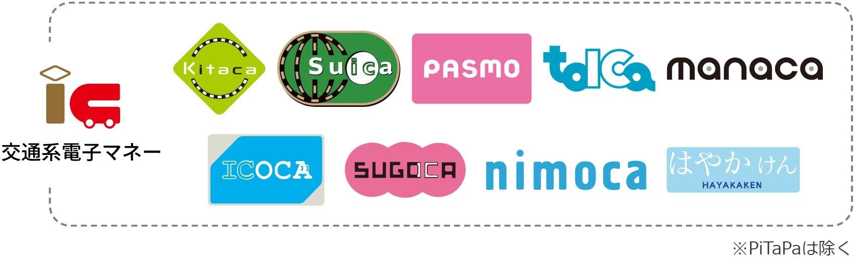 Kitaca、Suica、PASMO、TOICA、manaca/マナカ、ICOCA、SUGOCA、nimoca、はやかけん