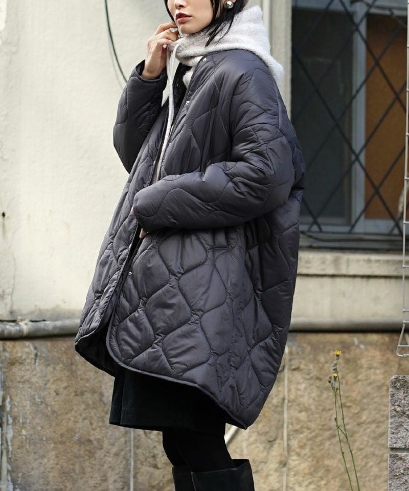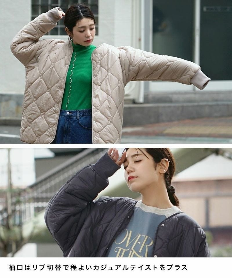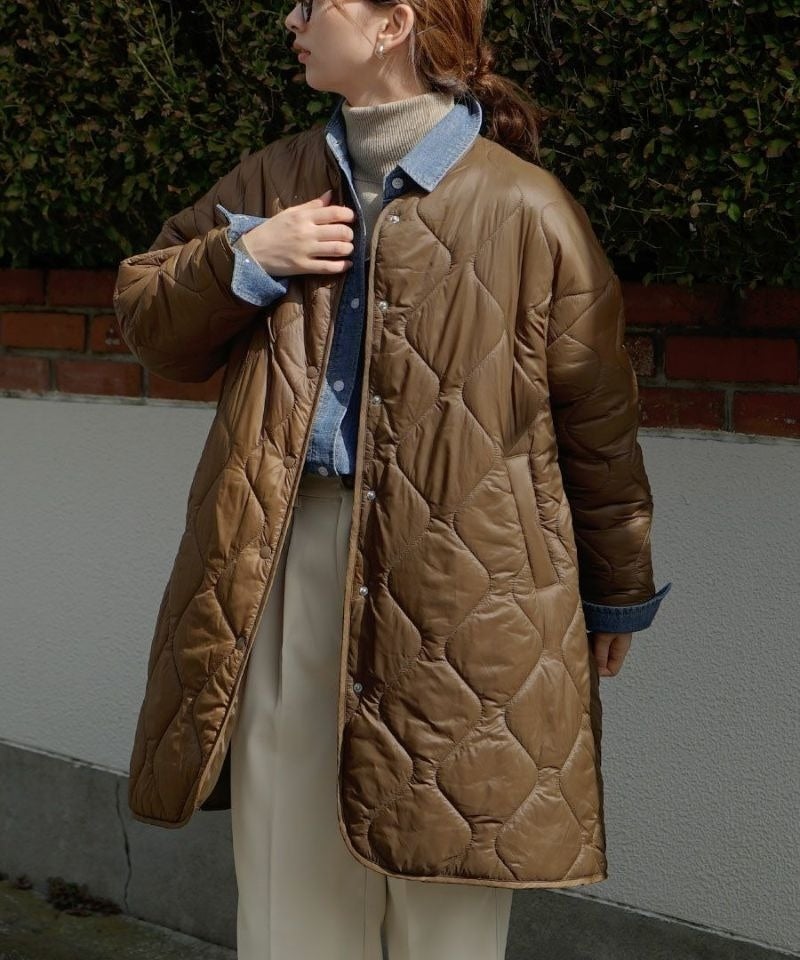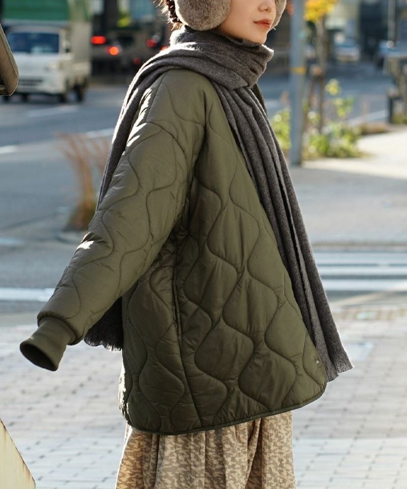 「エアリーナイロンキルティングアウター」の表地は、マットな光沢感のあるナイロン素材。そこに施されたやわらかな曲線を描く瓢箪模様のキルティング、そして丸みを帯びたゆったりとしたシルエットで、カジュアルはもちろんクラシカルにも、きれいめにもフェミニンにも、旬顔コーデにも。いろんなテイストにさっと馴染むため、とても便利に使えます。