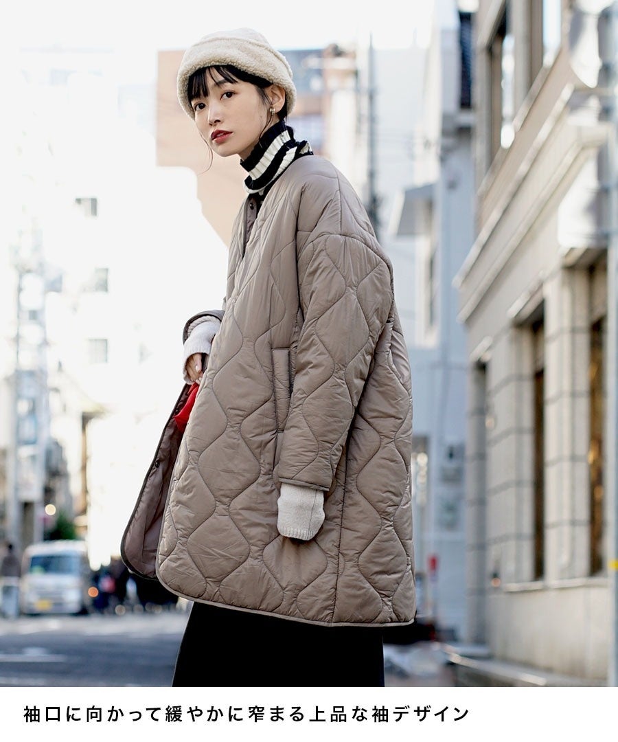 コートタイプは太ももをカバーする少し長めの着丈で、袖口に向かって緩やかにすぼまる上品なスリーブデザイン。袖丈はやや短めなので、袖部分のレイヤードスタイリングや、アームカバーなど手元のおしゃれも楽しんでいただけます。