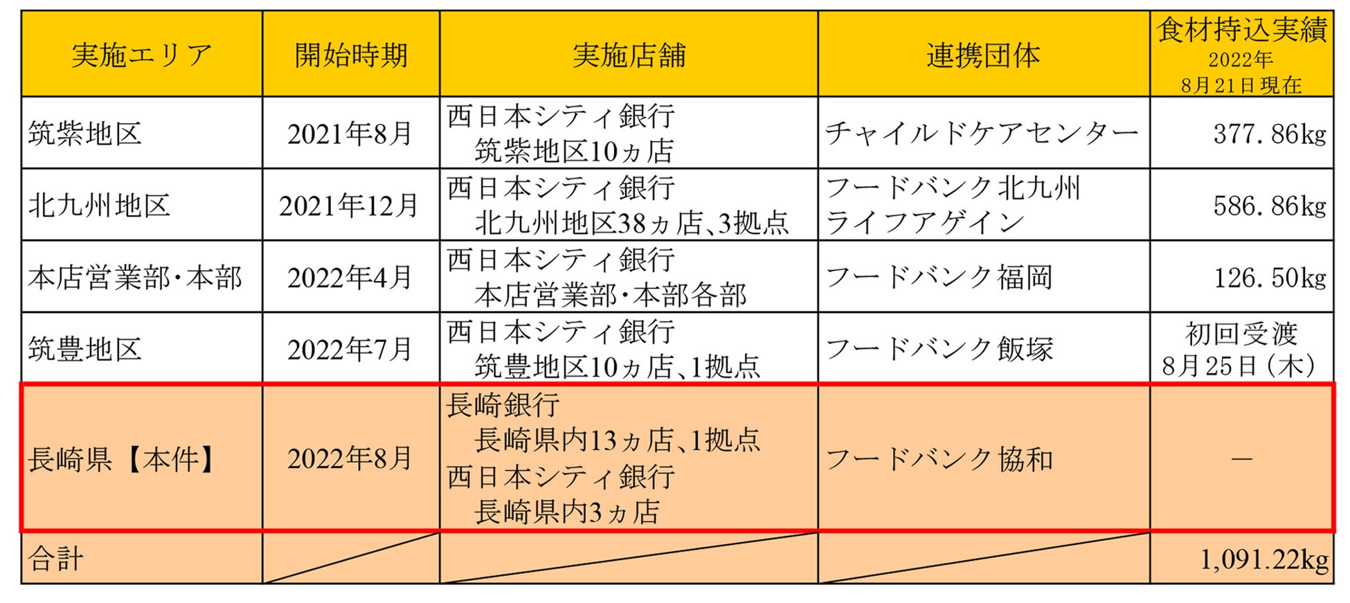 西日本シティ銀行(頭取 村上 英之)は、筑紫地区、北九州地区、本部・本店営業部、筑豊地区につづき、2022年8月22日から長崎県でも「フードドライブ活動※1」(以下「本活動」)を開始しますので、お知らせします。