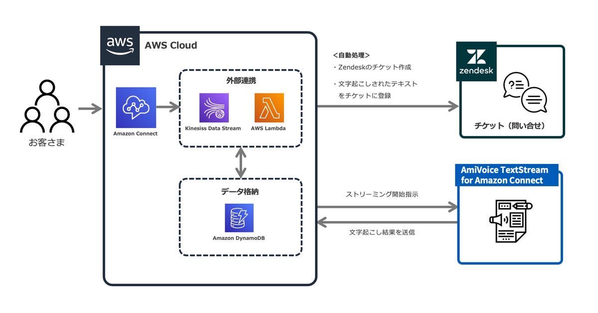 アドバンスト・メディアが提供するAmazon Connect(※1)の通話音声をテキスト化する音声認識API「AmiVoice TextStream for Amazon Connect」(※2)とZendeskを連携し、テキスト情報を終話後にZendeskへ反映できる仕組みです。また本サービスは、株式会社エクレクトが提供しています。