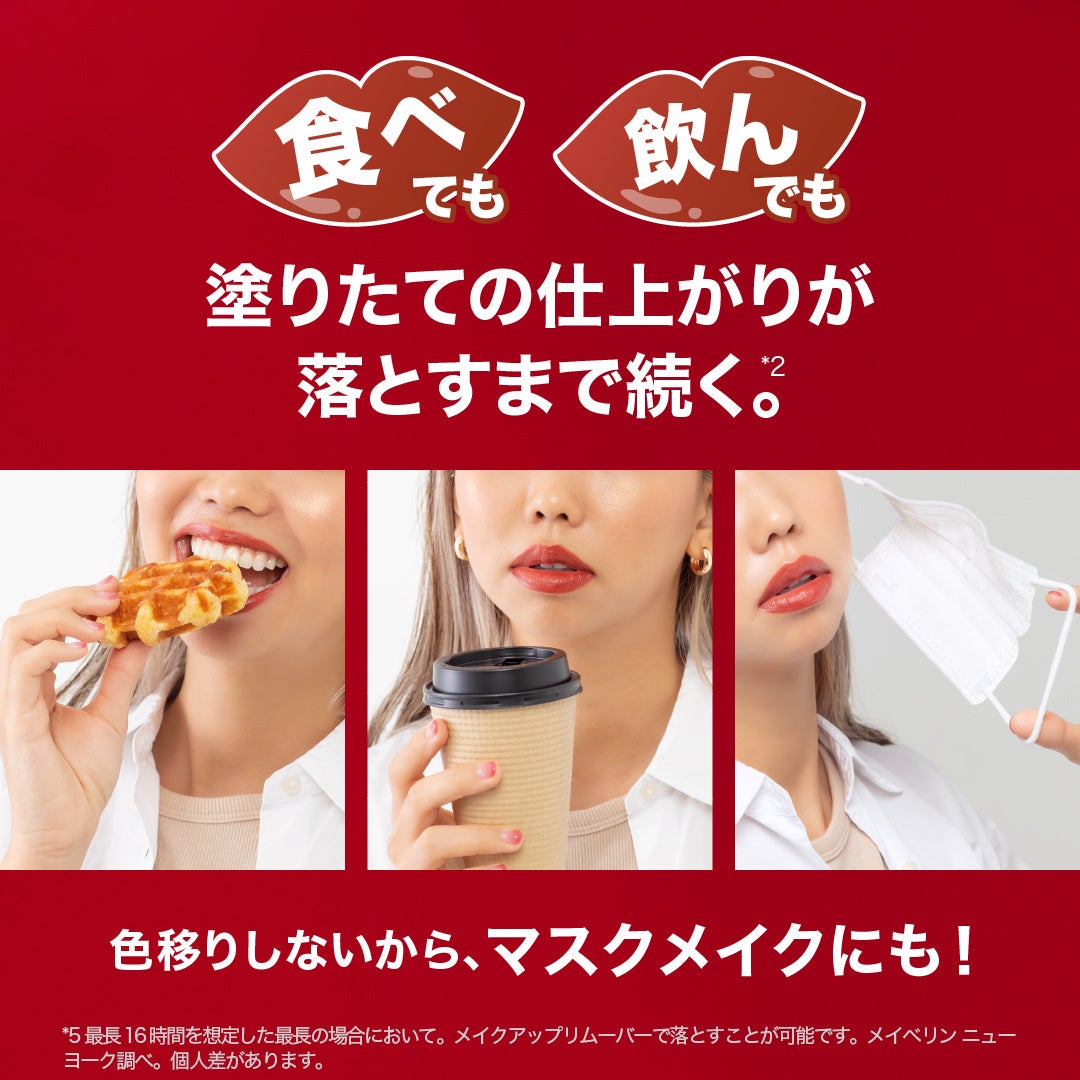 *2: 着用16時間を想定した最長の場合において。メイクアップリムーバーで落とすことが可能です。メイベリン ニューヨーク調べ。個人差があります。