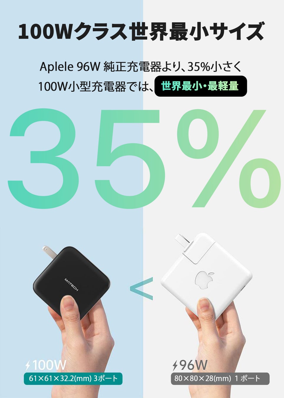 100Wのパワフルな出力なのに、手に収まるサイズまで小さくなりました。96WのApple 純正電源アダプターよりも約35%小さく、また、重量も約35%軽くなりました。(※2022/2/22 時点 自社調べ) 2ポート利用時でもノートPCを含む2台の機器を同時に急速充電が可能です。最大95Wの高出力と高い安全性の両立しつつも、嬉しいコンパクト設計を実現しました。