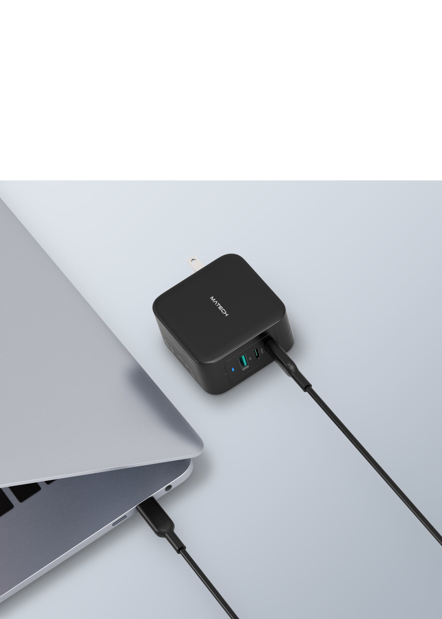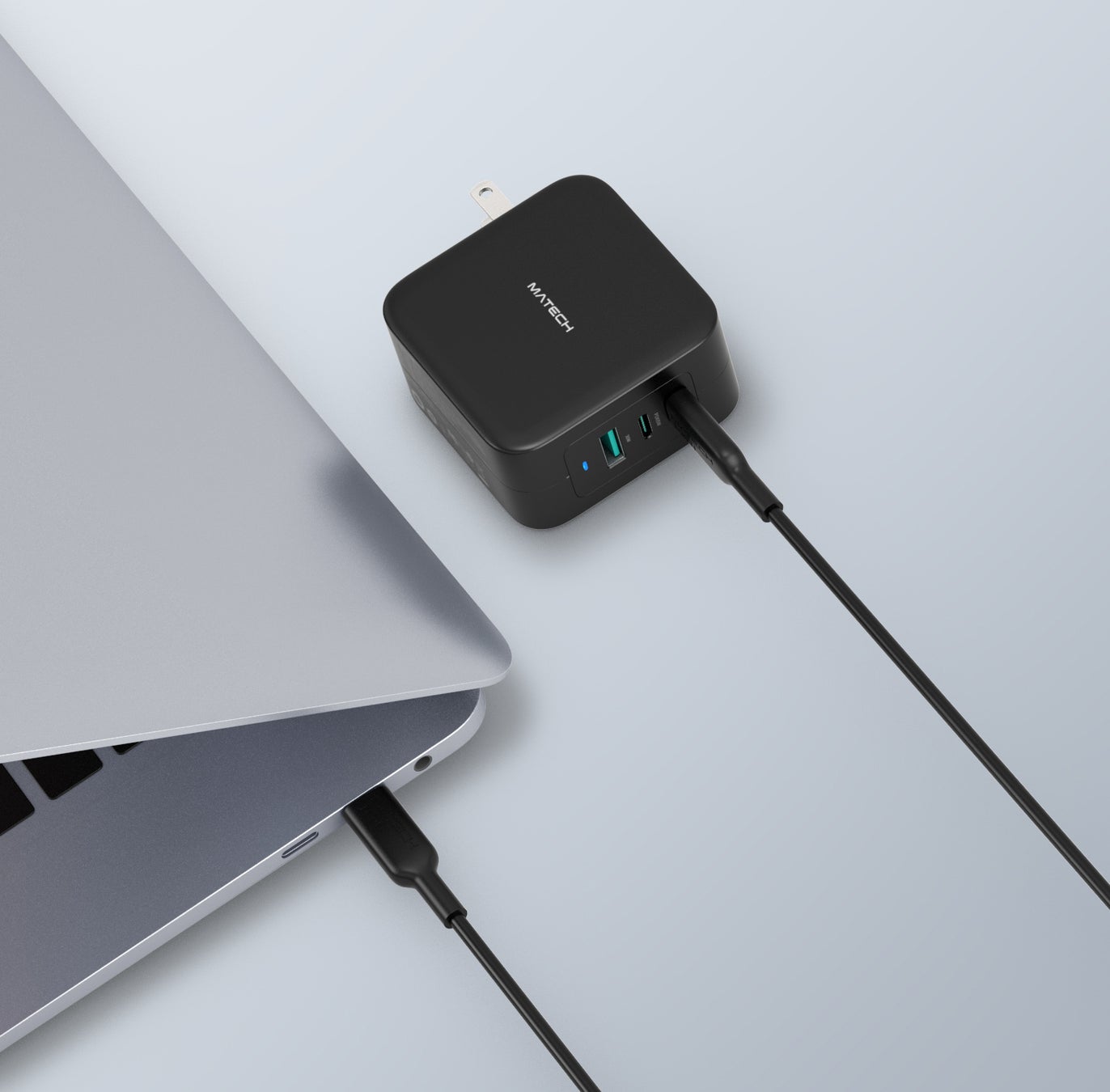 次世代USB急速充電器「MATECH Sonicharge 100W Pro」は、「パワフルさ」と「圧倒的なポータブル」を実現しました。次世代パワー半導体「GaN」を採用し、Power Delivery 3.0を搭載した単ポート最大100W出力のUSB Type-Cポート(以下Type-C)1つと、最大65W出力のUSB Type-Cポート(以下Type-C)1つと、Quick Charge 3.0/SCP/AFC/FCP/AP2.4/BC1.2を搭載した最大30W出力のUSB Type-A(以下USB-A)ポート1つを備えています。Type-C 2ポート合計でPD65W + PD30W 最大95Wのパワフルな出力が可能な上、ほとんど全てのUSB機器に最適な速度でフルスピード充電できるため、複数のモバイル機器を毎日使いこなしている方に最適です。