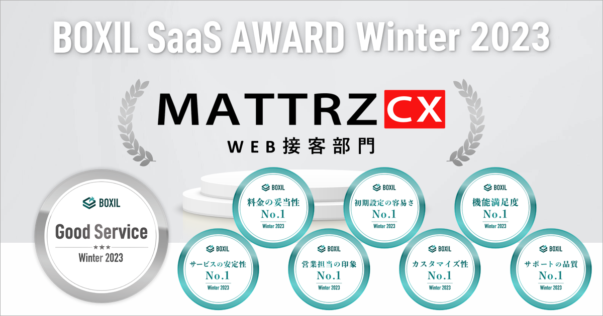 今回「MATTRZ CX」が受賞した「Good Service」は、「BOXIL SaaS」上に投稿された口コミを対象にWEB接客部門で総得点の高いサービスに対して、「料金の妥当性No.1」「初期設定の容易さNo.1」「サポートの品質No.1」「営業担当の印象No.1」「サービスの安定性No.1」「機能満足度No.1」「カスタマイズ性No.1」は、「BOXIL SaaS」上に投稿された口コミを対象にWEB接客部門の各項目において最も高い平均点を獲得したサービスに対して付与されるものです。