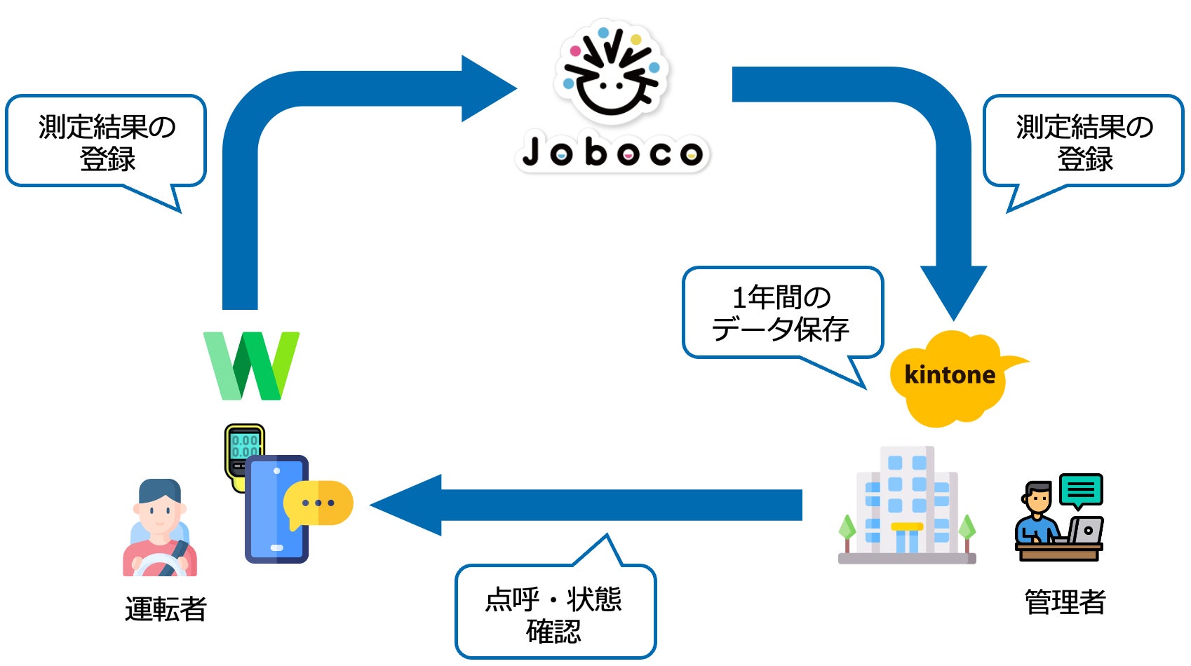 Jobocoエディションでは、すでに所有する携帯デバイスやアルコール検知器をそのまま活用することでコストを抑え、簡単な登録、確認、保存方法の仕組みのみを提供します。運転者は検査結果をチャットボットに回答するだけで、その内容はkintone上に自動で保存されます。管理者は紙による運用を行うことなく、kintone上に登録された内容を遠隔地から確認し、状況に応じて直接電話で確認することも可能です。