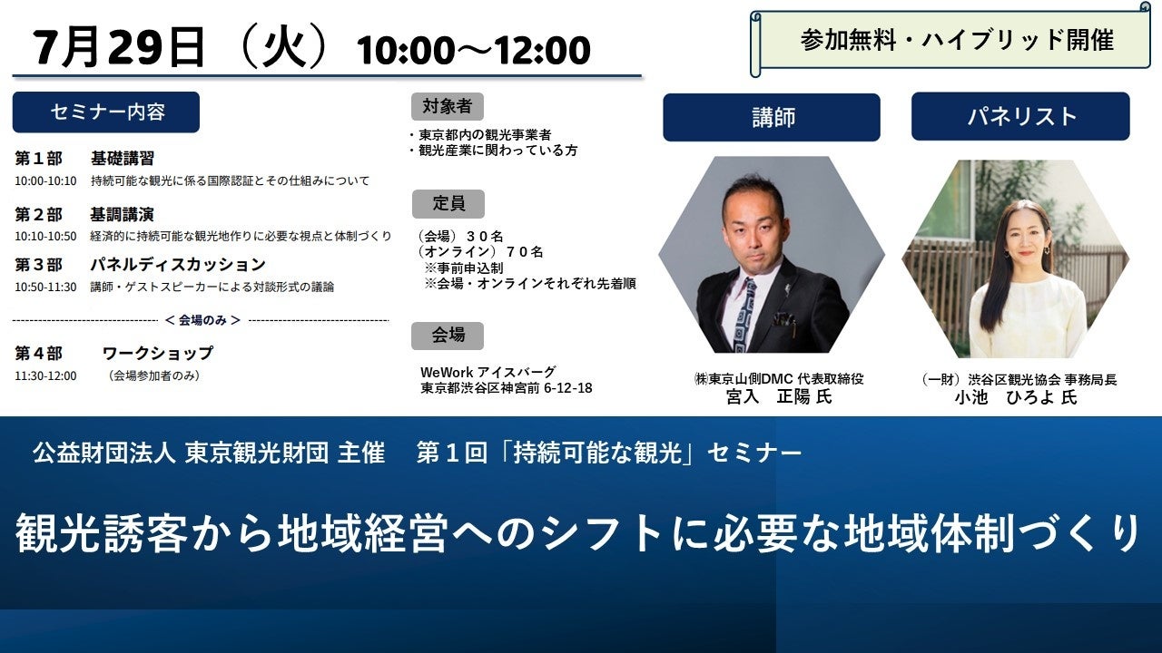 第1回となる本セミナーは、自治体と観光事業者が連携し、経済的にも持続可能な観光地域をどのように実現していくかをテーマに、株式会社東京山側DMC代表取締役 宮入正陽氏をお迎えし、多摩地域内での具体的な取り組み事例を交えて考察します。また、23区内より一般社団法人渋谷区観光協会事務局長 小池ひろよ氏をゲストにお迎えし、「地域の人と協力関係を築くためのプロセス・接点の作り方」について学ぶパネルディスカッションも実施します。その後、参加者同士のワークショップを通して、本テーマへの理解を深めていきます。この機会をぜひご活用ください。