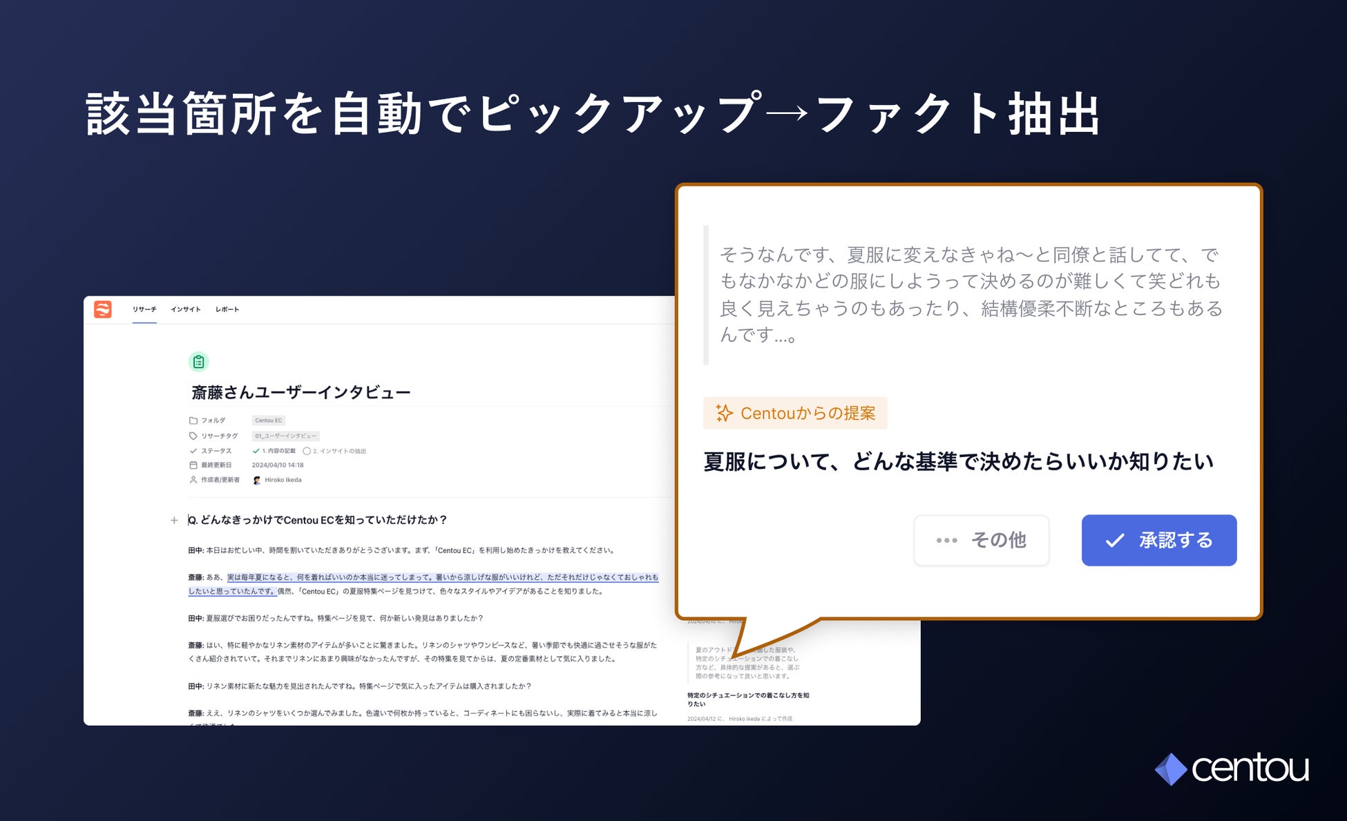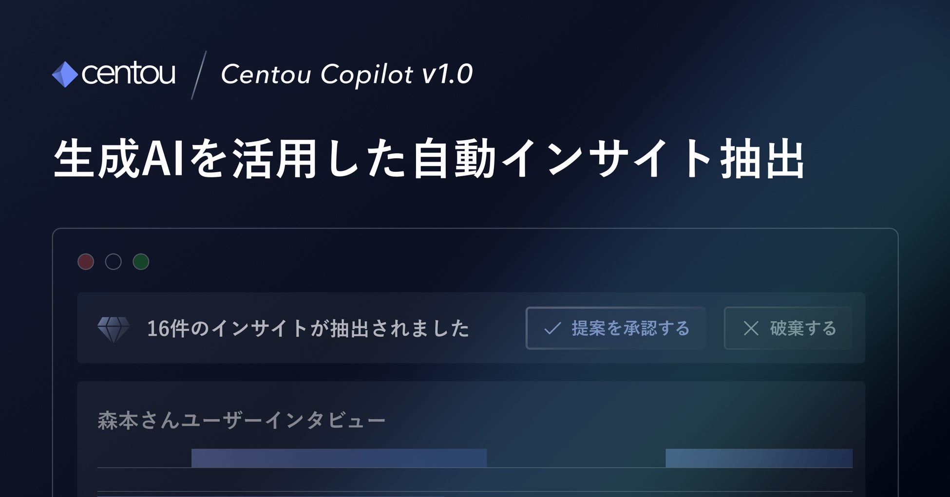 多くの実験を重ねながら、「ユーザーリサーチにおいて、生成AIを活用すべきポイント・そうでないポイント」を見極めてまいりました。そのような中で、今回試験的に提供を始めるのが、「Centou Copilot」(分析を大幅に補助する、あなただけの副操縦士)となります。
