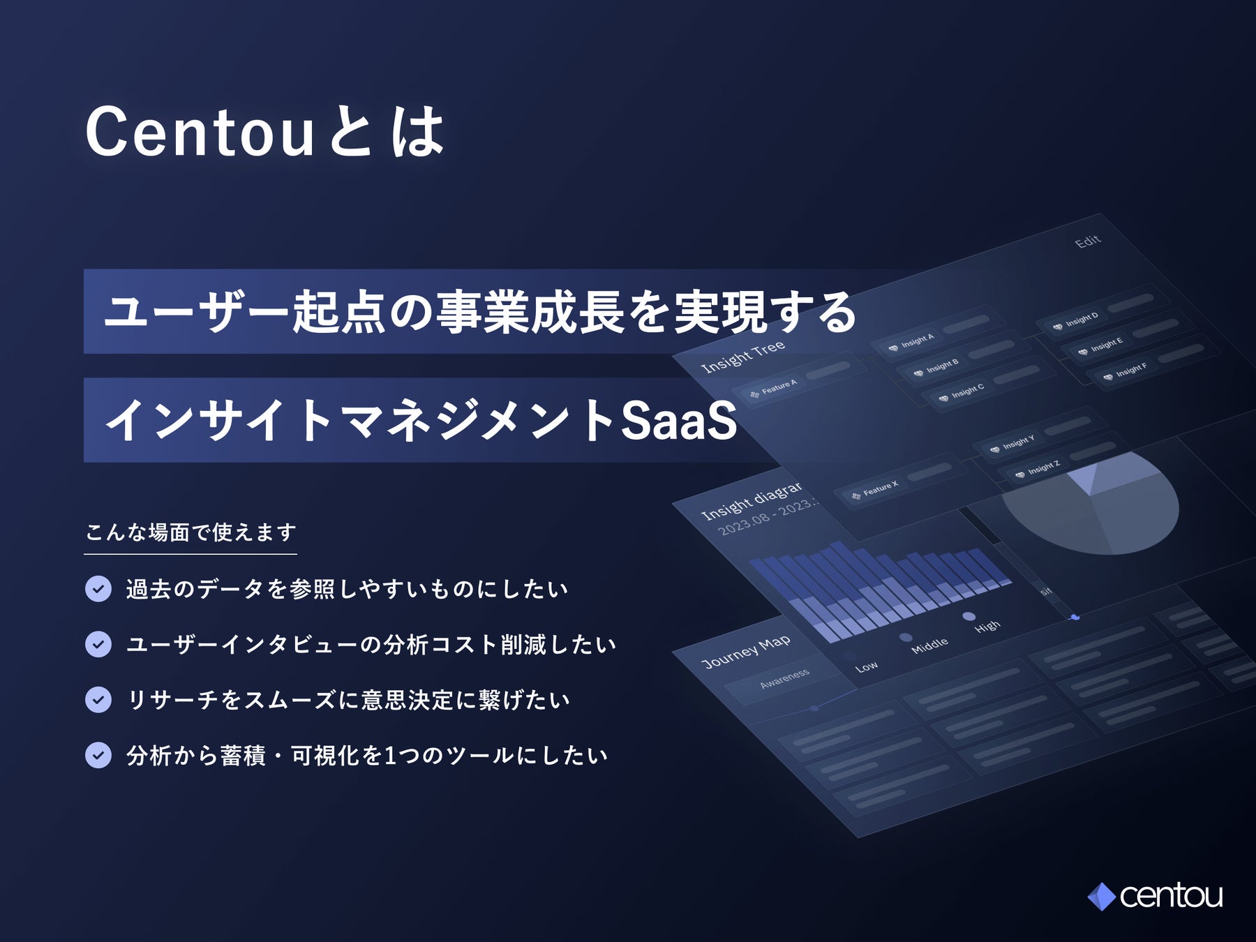 当社の提供する「Centou」は、ユーザーインタビューや顧客要望から得られたインサイトを管理し、ユーザー起点での事業成長を実現するインサイトマネジメントSaaSです。これまで、職種・部署ごとにバラバラに保存されていたデータや、属人的で参照しづらい過去データを一元管理し、スムーズに意思決定につなげられる革新的な体験で、スタートアップから大手メーカー、金融機関など、さまざまな領域、規模の企業様から反響をいただいております。