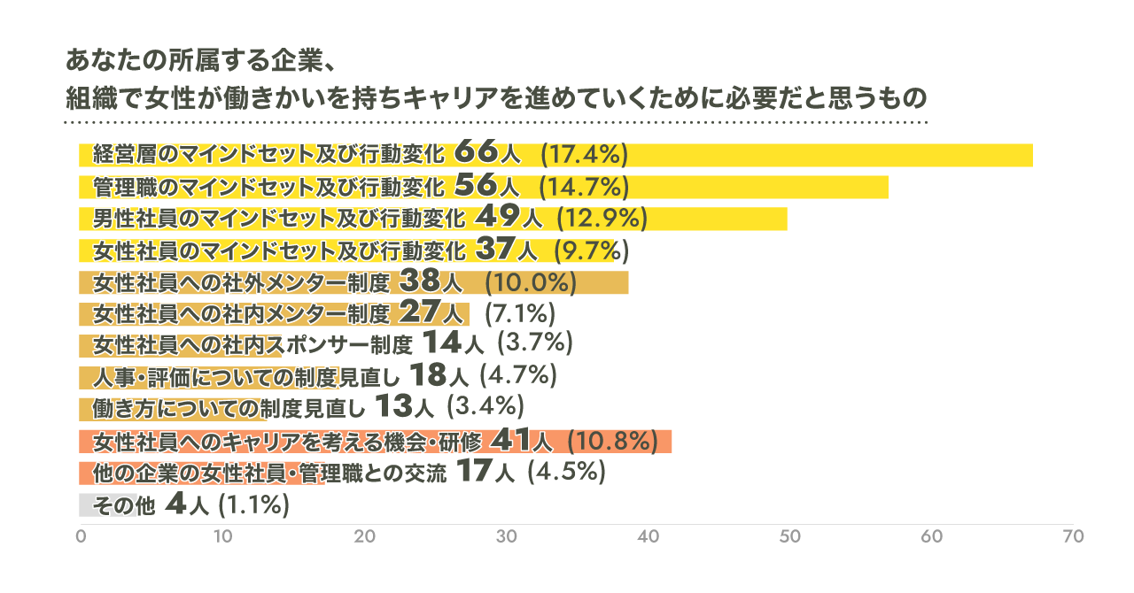 組織で女性が働きがいを持ちキャリアを進めていくために必要だと思うものについては、「経営層のマインドセット及び行動変化(17.4%)」が最も多く、続いて「管理職のマインドセット及び行動変化(14.7%)」でした。女性が組織で働きがいをもち、キャリアを進めていくには、管理職や経営層といった組織の上層部のマインドセット、行動が大きく影響していることが明らかになりました。