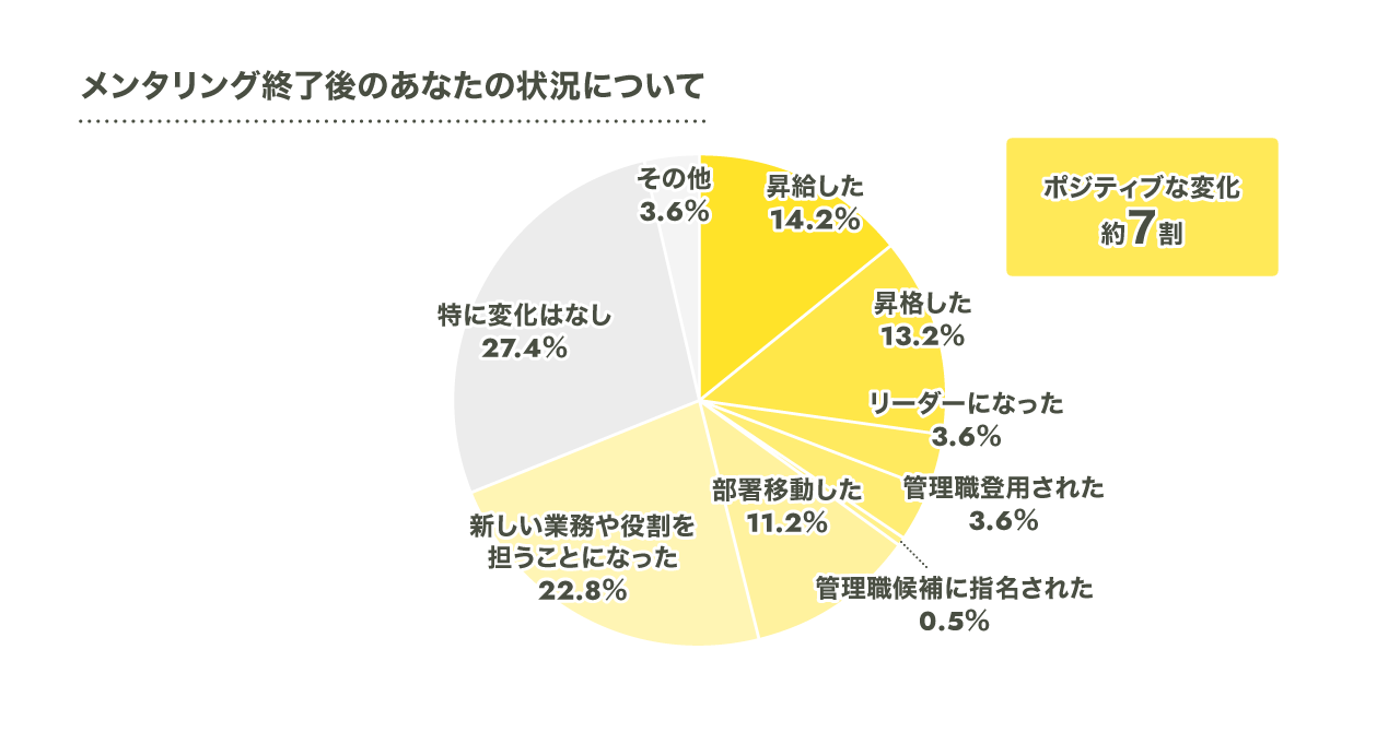 メンタリング終了後の状況について質問したところ、管理職登用された(3.6%)をはじめ、新しい業務やポジションを任されたり、管理職昇格・昇給するなどポジティブな変化があったと回答したメンティが7割近く(69%)に達しました。