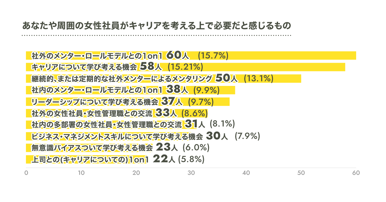 女性がキャリアを考える上で必要だと感じるものについては、「社外のメンター・ロールモデルとの1on1(15.7%)」が最も多く、続いて「キャリアについて学び考える機会(15.2%)」「継続的、または定期的な社外メンターによるメンタリング(13.1%)」でした。女性がキャリアを考える上で、社外メンターやロールモデルとの1on1が重要であることがわかる結果となりました。