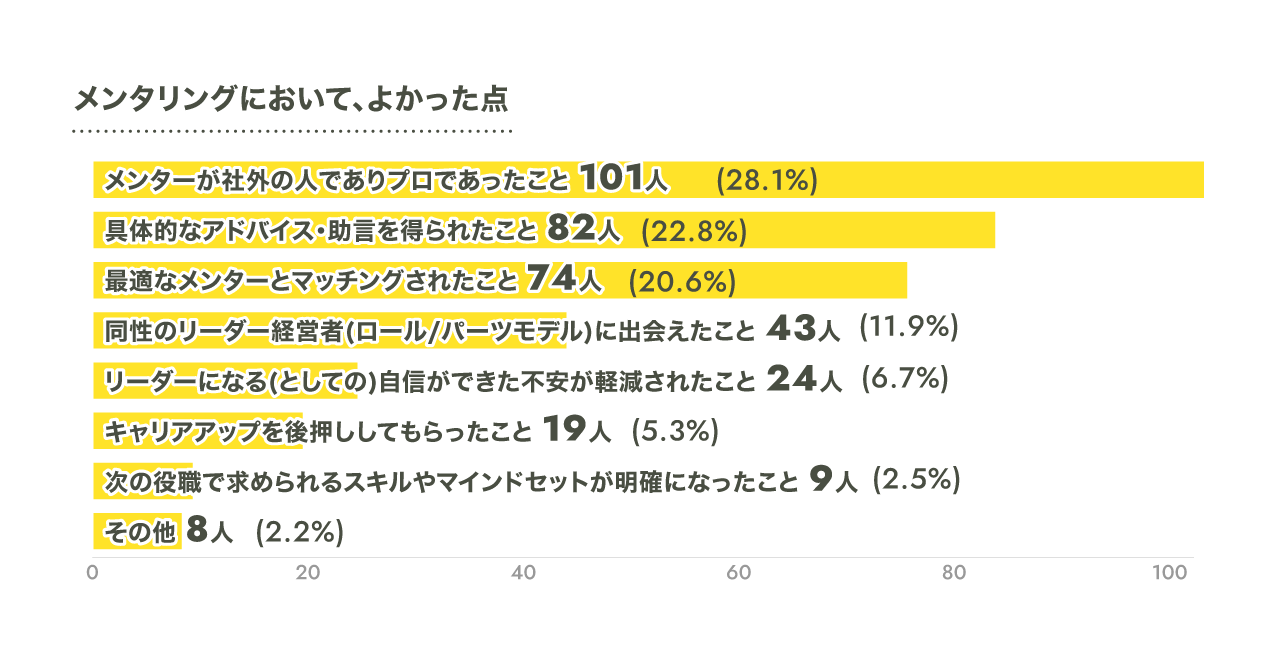 メンタリングにおいて良かった点で最も多く回答があったのは「メンターが、社外の人であり、プロであったこと(28.1%)」「具体的なアドバイス・助言を得られたこと(22.8%)」、続いて「最適なメンターとマッチングされたこと(20.6%)」でした。メンターが社外の人であることや、Mentor Forのナレッジをベースにしたキャリアメンターのスクールで学び、審査を経たプロであることが、高い効果につながっていることがわかりました。
