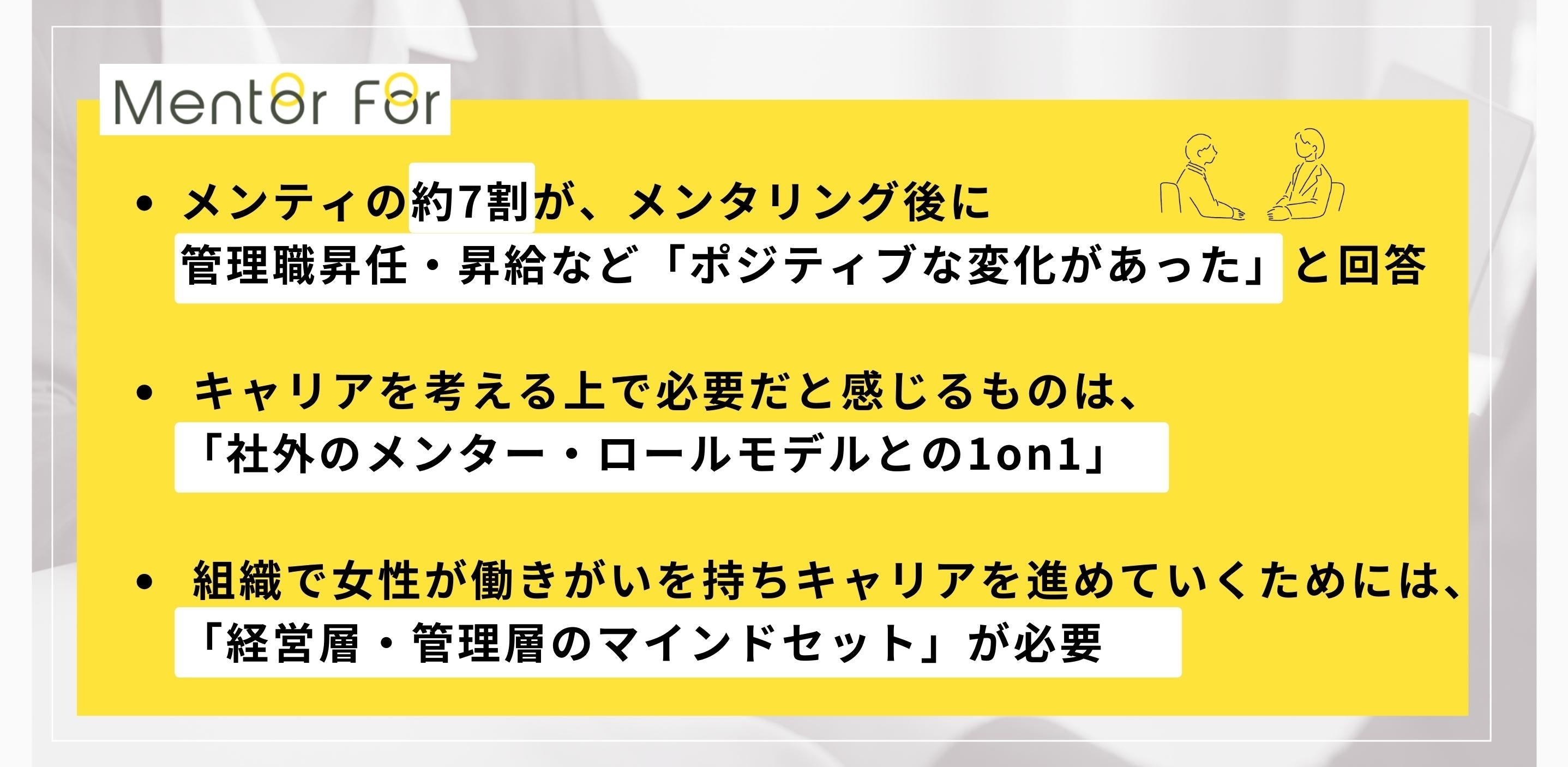 昨今、人的資本開示の項目として、女性管理職比率を公開する企業が増えてきている中、比率向上の施策として、社外メンターへの期待が高まっていることを感じております。
