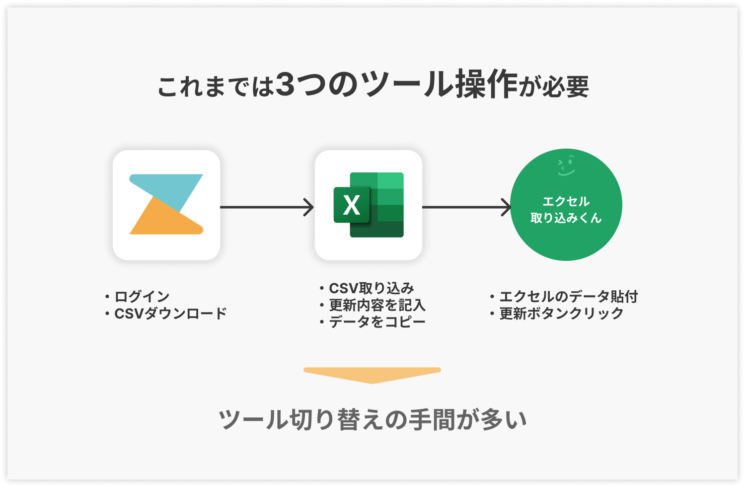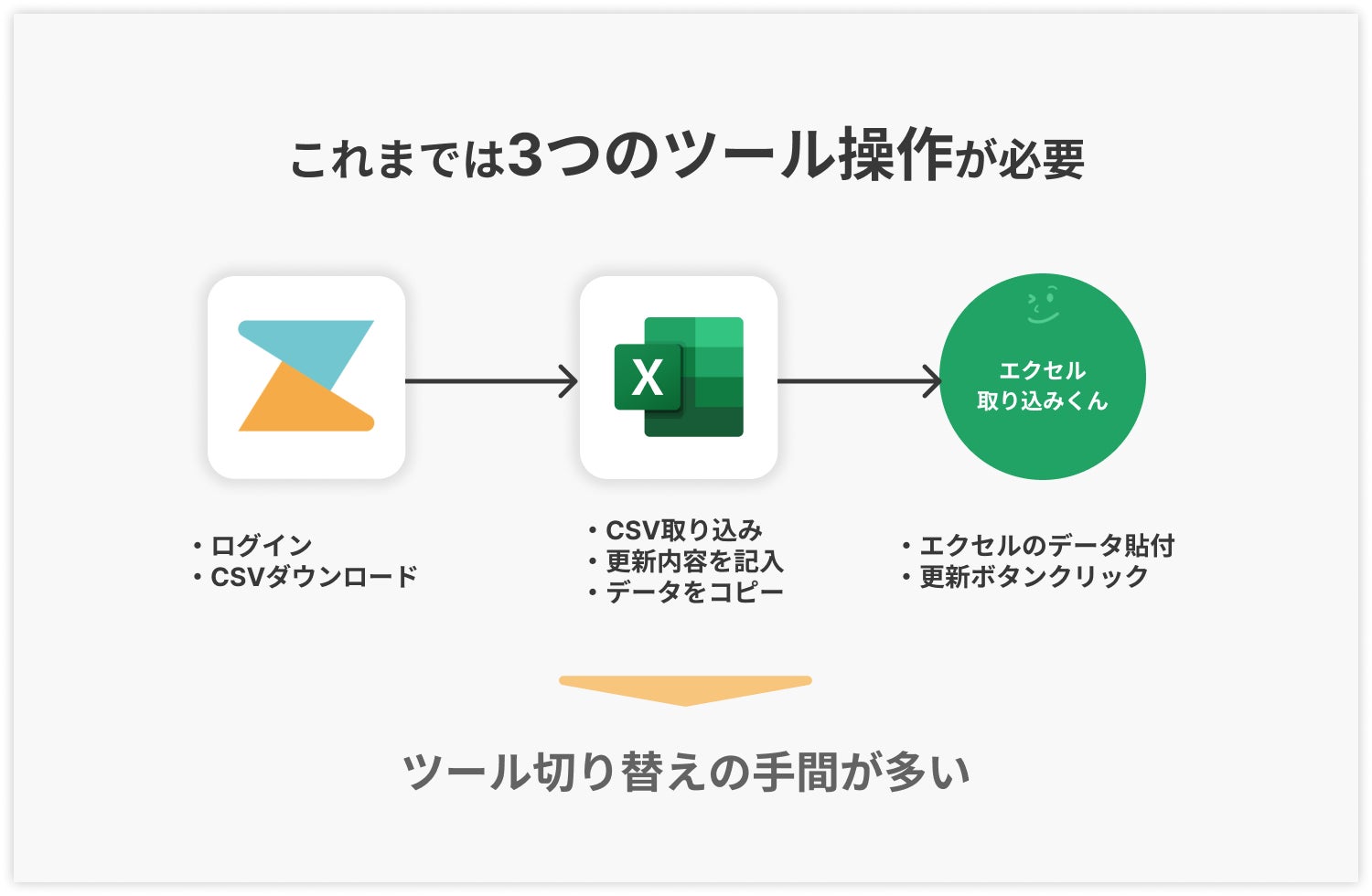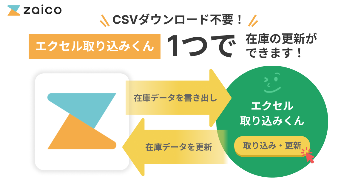 zaicoで大量の在庫データを更新する場合、今まではzaicoから在庫データをcsvファイルでダウンロードし、エクセルに変換・修正して、Excelエクセル取り込みくんにデータを貼り付け直して更新するという流れでした。これでは、ファイル変換が必要だったり、エクセルを2つ並べて操作したり、と作業が煩雑で手間がかかっていました。